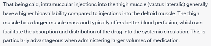 Фармакокинетика при уколе в дельту или жопу не отличается. Спрашивал у ЧатЖПТ, но только о сравнении биодоступности при уколах в дельту и бедро, на что он ответил Правда у меня бесплатная версия 3.5 )) Может 4-ка ответит как-то иначе ![]() |