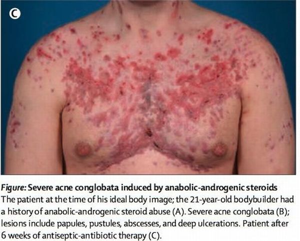 От сильнейшего передоза (возможно) почки могут отказать, затрудняюсь даже назвать дозу, она совершенно фантастическая для стероидов. Насчет доз я незнаю,ног хочу привести пример с рисунками. На рисунках: тяжелые конглобатные угри, вызыванные приемом анаболических стероидов. Эти угри также называют нагроможденными. Они оставляют после себя рубцы на коже. Рисунок A: пациент во времена своей лучшей физической формы. 21-летний бодибилдер злоупотреблял анаболическими стероидами с андрогенным эффектом. B: тяжелые конглобатные угри. Поражения включают папулы, пустулы, абсцессы и глубокие изъязвления. C: пациент после 6-недельной антибиотикотерапии.