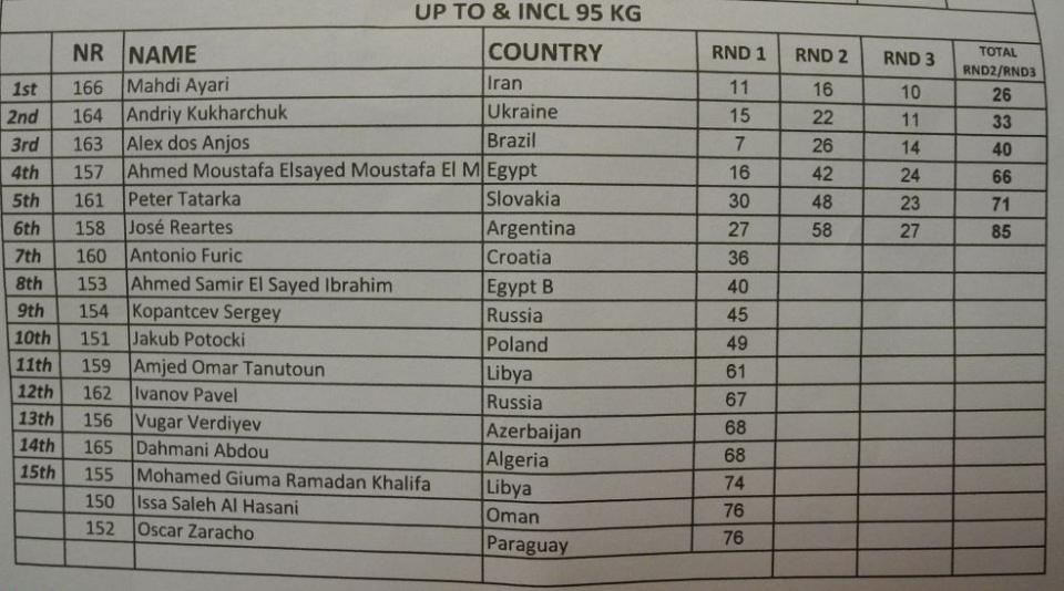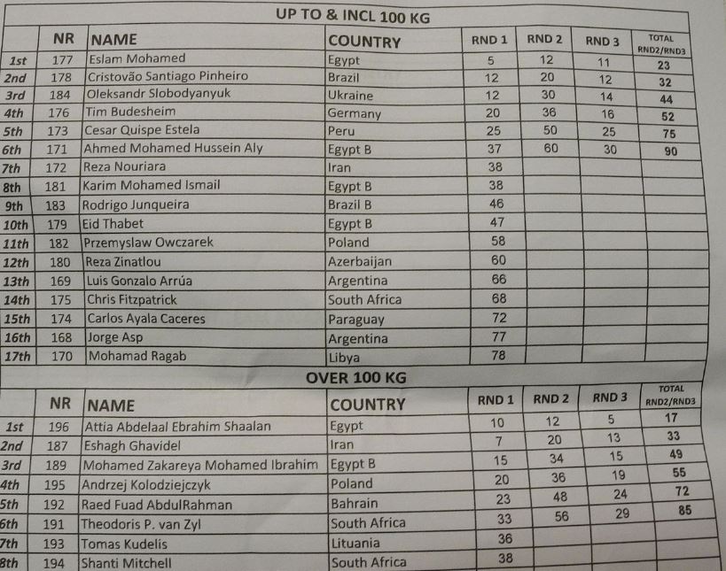 В финале (60 кг) два представителя Индии, и по одному из Шри-Ланки, Кореи, Аргентины и Эквадора. Никаких особенностей для читателей озвучить не могу, красочного действа не было. Пустое дело также как и в следующей категории. Египет, Италия (2), Шри-Ланка (2), Корея. Хотя попробую угадать победителей в категориях. 60 кг #3 Seunghoon Lee (Корея), а в 65 кг Daniel Sticco (Италия) #13. Категория 70 кг. Тут повеселее все. 24 атлета. В финале (опять статистика) Иран, Гон Конг, Бразилия, Корея, Польша и Египет. Победителя угадывать не буду. Наш Андрей Тихонов в хорошей форме, но «выше ростом». Объемов не хватает для такой компании. Увы. Категория 75 кг. 24 спортсмена. И было из кого выбирать. Арабы и К во всей красе. В ТОП-6 только один европеец Эдуард Дерцапф. Бразилия, Египет (2), Бахрейн, Иран. Напишу прямо здесь… Наверное в Европе атлеты из России все-таки являются лидерами. Но вот в мире… В мире в массовом порядке правят бал культуристы из арабских стран и из Ирана. Резьба по кости очень часто компенсирует отсутствие пропорций и другие недостатки. Они сегодня лидеры. Не первый год, кстати. Да и не последний. Поддержка бодибилдинга на национальном уровне, финансирование и почет на Родине. Категория 80 кг. 30 участников. Самая многочисленная категория чемпионата. И одновременно самая подготовленная, качественная, смотрибельная. Отбор полуфиналистов и в линии вообще оказалось очень много атлетов в хорошей и в отличной форме. Корея, Ливия, Иран (2), Египет и Алжир. Как-то вот так. Можно написать так: «одни и те же лица». Ставлю на победу #91 Babak Akbarnia (Египет). Игорь Лосев мимо финала. И не потому что не в форме, а потому что ОЧЕНЬ СИЛЬНАЯ КАТЕГОРИЯ. И если бы он не был несколько мягковат в задних позах… Впрочем «если» на Чемпионатах Мира не канает… Категория 85 кг. 23 человека. И уж тут «просочились» Испания и Италия, но в целом все знакомо. Алжир, Египет (2), Иран. В этой категории увидел, как для улучшения внешнего вида ног задирают вверх большие пальцы на ступнях. Такая вот методика… Категория 90 кг. Опять 23 человека. Уровень тоже неплох. И в финале нет засилья от арабских атлетов. Швеция, Польша и УКРАИНА. Плюс Оман, Египет и Иран… Желаю самого высокого места Владиславу Можаре #145! Категория 95 кг. 17 человек и работа судей без выбора полуфиналистов. Все полуфиналисты. Все с местом. Да… Лучший на мой взгляд Андрей Кухарчук #164. Может случиться так, что не на мой взгляд победителем станет #163 Alex Dos Anjos (Бразилия). Сергей Копанцев мимо финала, думаю, что в итоговом протоколе будет 7-8. Завтра посмотрим. Категория 100 кг. По всеобщему мнению одна из самых слабых категорий не только на этом Чемпионате, но и за последнее время. Александр Слободянюк и Eslam Mohamed (Египет). Уверен, что чемпионом мира будет Саша. Категория 100+… Печальное зрелище. Павел Филлиборн разводит руками. Это же ЧМ!!! Победит иранец #187 Eshagn Ghavidel. Да уж… Не могу не отметить: ОСВЕЩЕНИЕ!!! Столь поганого освещения сцены я давно не видел. Блики, отсветы, тени… Освещено все что угодно, но только не линия в которой сравнивают спортсменов. Сама сцена оформлена на 5+. Приятные тона ласкают взгляд, но вот для чего так много внимания уделять подсвечиванию этих самых тонов и совершенно наплевать на главное, на возможность оценки атлетов??? На сегодня у меня все. Надеюсь, что 18 кг бронзы увезут с собой ребята из Украины… Чуть не написал в Украину… А.ТИМОШЕНКО & И.КОПЧЕК