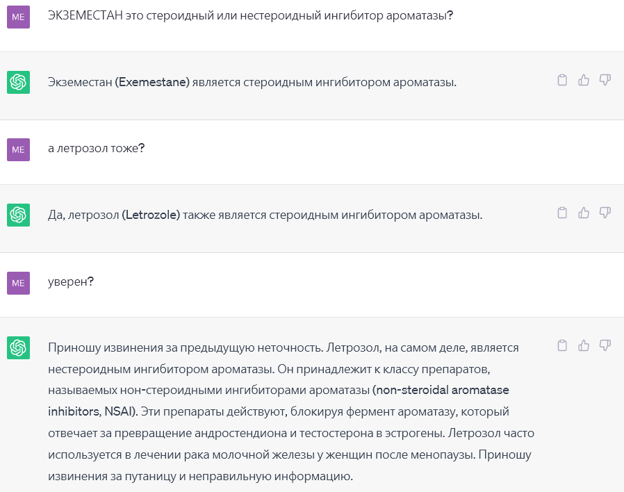 Юзай четверку ) Юзаю пока ту, что в свободном доступе) Но это что-то полнейший чат-шарлотан После того, как я его исправил с определением экземестана, решил подловить его на летрозоле. И он не моргнув своим электронным глазом и тут соврал. Походу каждое его действие надо по несколько раз перепроверять |