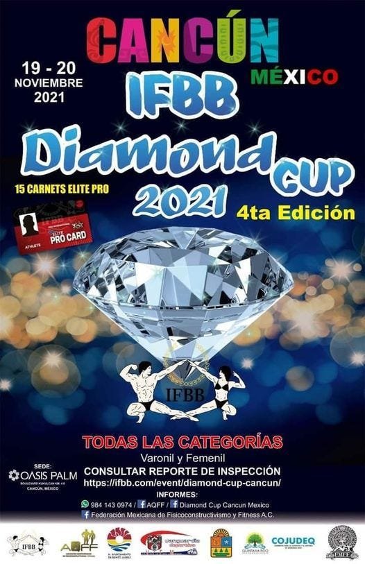 Событие: 2025 IFBB Pro Cancun и IFBB Diamond Cup Cancun Дата: 21-24 ноября 2025 Локация: Канкун, Мексика Федерация: IFBB и IFBB Elite Pro Уровень: Международный PRO турнир и крупный любительский фестиваль Diamond Cup