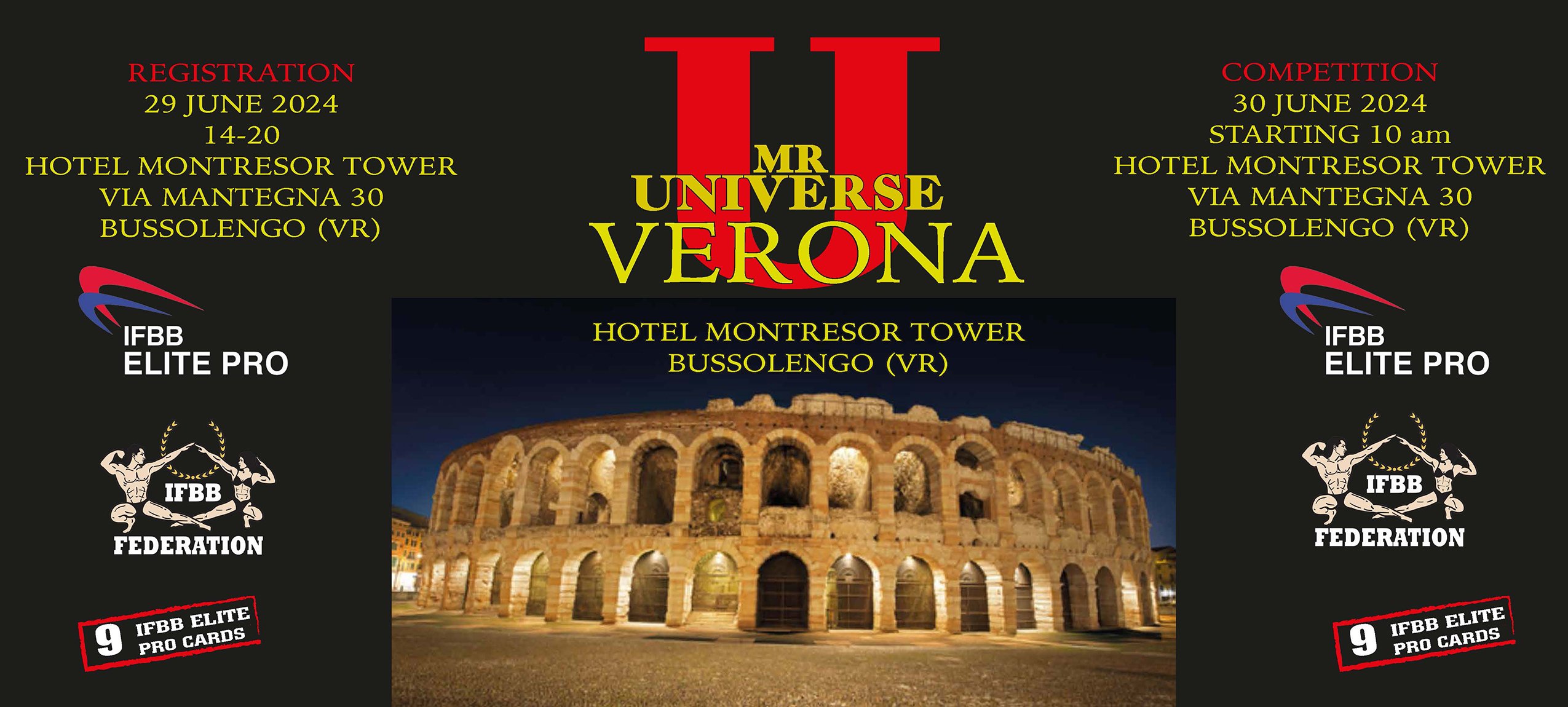 Событие: 2025 IFBB Mr Universe Verona Дата: 22–23 ноября 2025, суббота–воскресенье Локация: Буссоленго, провинция Верона, Италия, Hotel Montresor Tower, Via Mantegna 30 Федерация: IFBB (International Fitness and Bodybuilding Federation) (IFBB) Уровень: Международный любительский турнир, IFBB Pro Card Qualifier и международный рейтинговый квалификатор Категории PRO: Любительские категории бодибилдинга и фитнеса (мужской бодибилдинг, Classic Bodybuilding / Classic Physique, Men’s Physique, Women’s Bikini, Wellness, Bodyfitness и др.) с розыгрышем IFBB Elite Pro Card и очков мирового рейтинга между абсолютными чемпионами по дивизионам