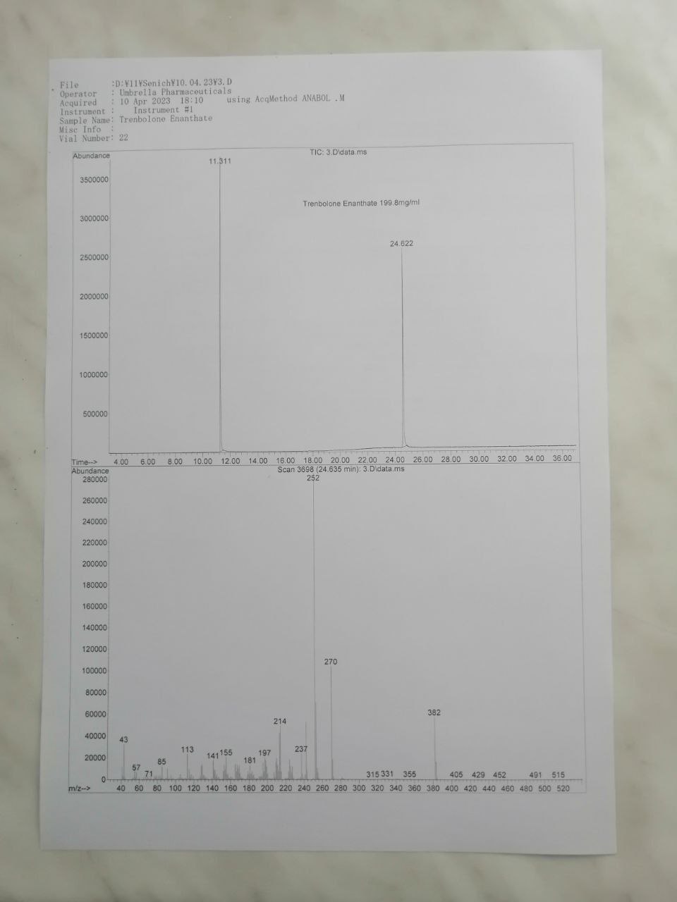 “Umbrella Pharmaceuticals" BOLDENONE UNECYLENATE Образец представляет собой виалу объёмом 10мл. В которой ДВ Болденон Ундесиленат заявлено 200мг/мл. 1) Хроматография: образец содержит Болденон Ундесиленат. 2) Масс-спектрометрия: содержание ДВ в образце ~199.2мг/мл. 3) Посторонние примеси: НЕ ОБНАРУЖЕНЫ