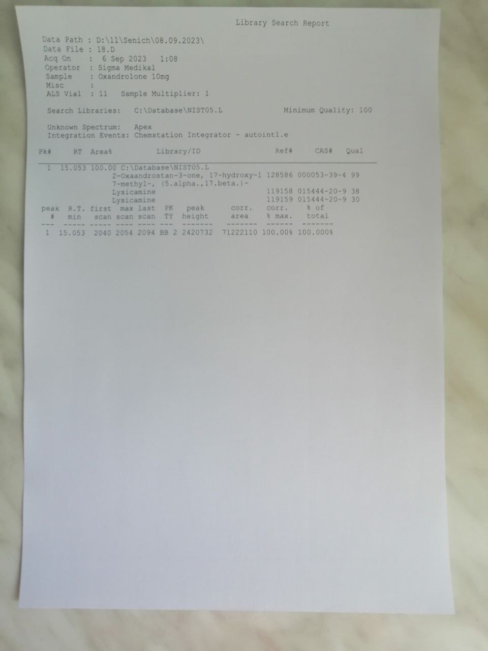 «Sigma Medical» OXANDROLONЕ 10 Образец представляет собой таблетки белого цвета. В которых ДВ Оксандролон заявлено 10мг/tab 1) Хроматография: образец содержит Оксандролон. 2) Масс-спектрометрия: Содержание ДВ в образце ~ 9.2мг/таб 3)Посторонние примеси: НЕ ОБНАРУЖЕНЫ