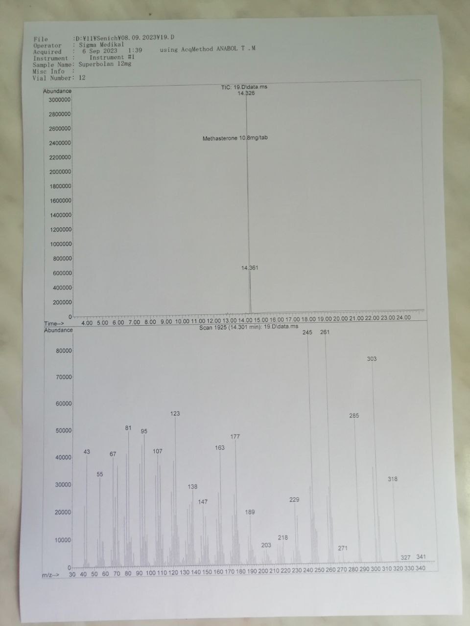 «Sigma Medical» SUPERBOLAN 12 Образец представляет собой таблетки белого цвета. В которых ДВ Метастерон заявлено 12мг/таб 1) Хроматография: образец содержит Метастерон. 2) Масс-спектрометрия: Содержание ДВ в образце ~ 10.8мг/таб 3)Посторонние примеси: ОБНАРУЖЕН ФЕНАНТРЕН !!!