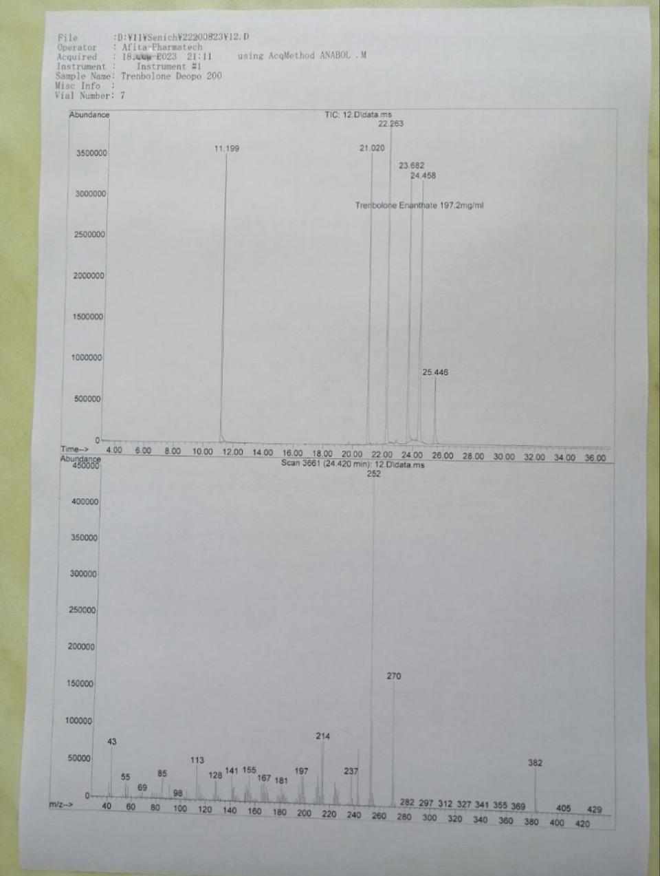 “Afita-Pharmatech” TRENBOLONE DEPO 200 Lot: 333052 Образец представляет собой ампулы объёмом 2мл. В которой ДВ Тренболон Энантат заявлено 200мг/мл. 1) Хроматография: образец содержит Тренболон Энантат. 2) Масс-спектрометрия: содержание ДВ в образце ~197.2мг/мл. 3) Посторонние примеси: НАЙДЕНА 2-НАФТОЙНАЯ КИСЛОТА.