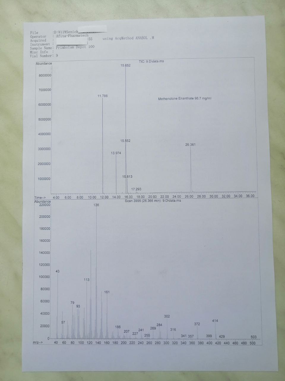 “Afita-Pharmatech” PRIMOBOLAN DEPOT 100 Lot: 598433 Образец представляет собой ампулы объёмом 2мл. В которой ДВ Метенолон Энантат заявлено 100мг/мл. 1) Хроматография: образец содержит Метенолон Энантат. 2) Масс-спектрометрия: содержание ДВ в образце ~96.7мг/мл. 3) Посторонние примеси: НЕ ОБНАРУЖЕНЫ