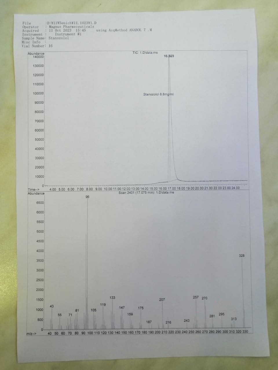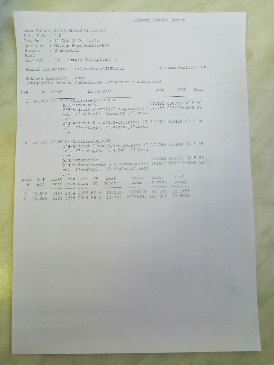 “Magnus Pharmaceuticals” STANOZOLOL Batch No: 202304 Образец представляет собой таблетки белого цвета. В которых ДВ Cтанозолол заявлено 10мг/таб. 1) Хроматография: образец содержит Станозолол. 2) Масс-спектрометрия: содержание ДВ в образце ~ 8.8мг/таб 3) Посторонние примеси: НЕ ОБНАРУЖЕНЫ.