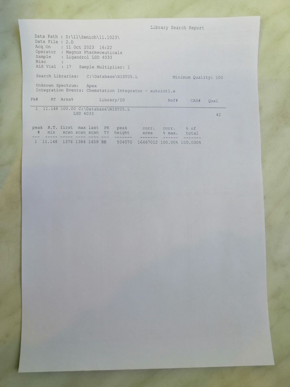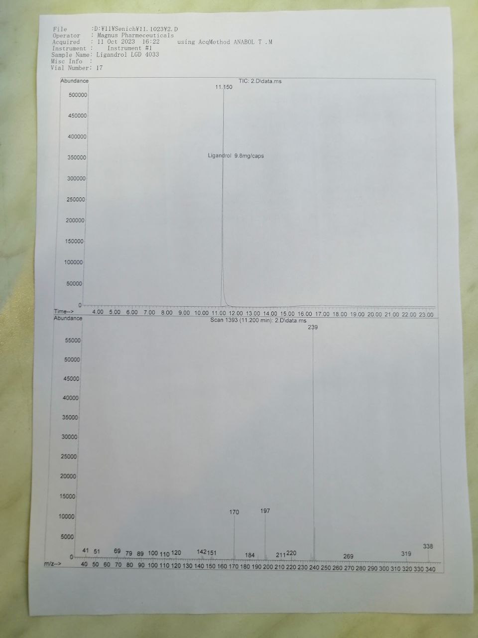 “Magnus Pharmaceuticals” LIGANDROL LGD-4033 Образец представляет собой капсулы черного цвета. В которых ДВ Лигандрол заявлено 10мг/капс. 1) Хроматография: образец содержит Лигандрол. 2) Масс-спектрометрия: содержание ДВ в образце ~ 9.8мг/капс. 3) Посторонние примеси: НЕ ОБНАРУЖЕНЫ.