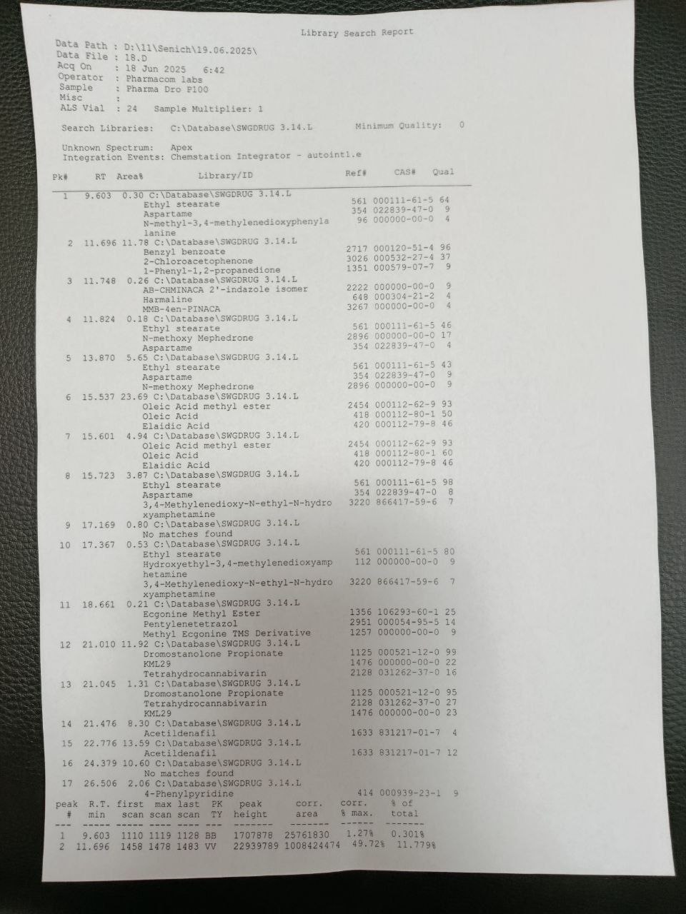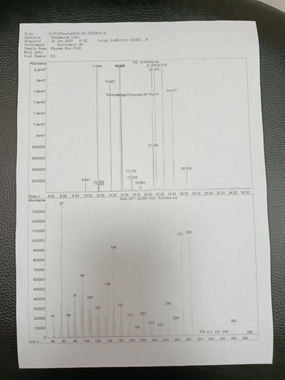 "Pharmacom Labs" PHARMA DRO Р100 The sample is a 10ml vial. In which the active substance Drostanolone Propionate is declared 100mg/ml. 1) Chromatography: the sample contains Drostanolone Propionate. 2) Mass spectrometry: the active substance contained in the sample is ~99.7mg/ml. 3) Foreign impurities: CHEMICAL COMPOUND FOUND CANNABIOD AB-CHIMINACA 2' INDAZOLE ISOMER!!! TROPANE ALKALOID ECGONINE METHYL ESTER FOUND!!! SYNTHETIC COMPOUND ACETILDENAFIL FOUND!!! CHEMICAL COMPOUND 4-PHENYLPYRIDINE FOUND!!!