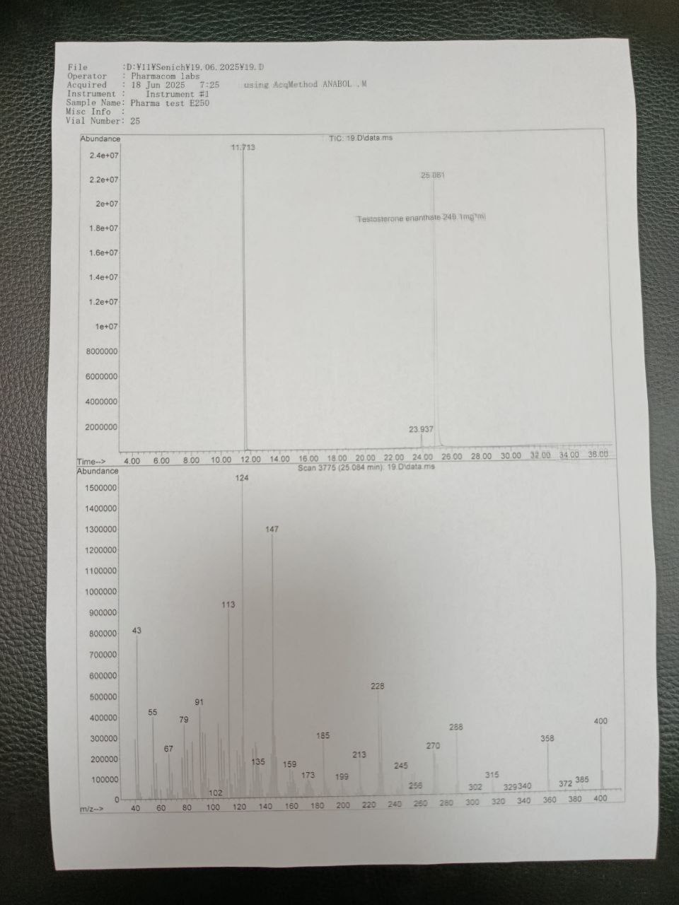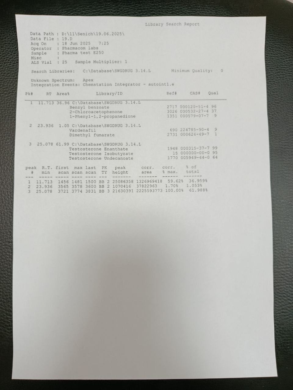 "Pharmacom Labs" PHARMA TEST E250 The sample is a 10ml vial. In which the active substance Testosterone Enanthate is declared 250mg/ml. 1) Chromatography: the sample contains Testosterone Enanthate. 2) Mass spectrometry: the active substance contained in the sample is ~249.1mg/ml. 3) Foreign impurities: PHOSPHODIESTERASE INHIBITOR FOUND - VARDENAFIL!!!