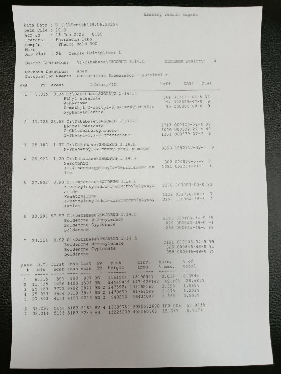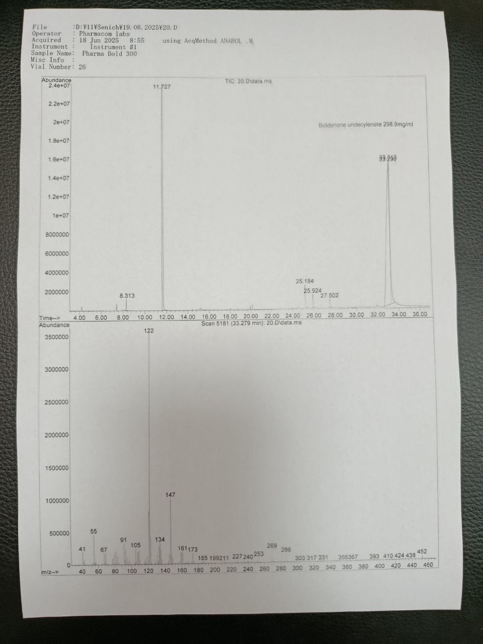 “Pharmacom Labs" PHARMA BOLD 300 The sample is 1ml ampoules. In which the active substance Boldenone Undecylenate is declared 300mg/ml. 1) Chromatography: the sample contains Boldenone Undecylenate. 2) Mass spectrometry: the content of active substance in the sample is ~298.9mg/ml. 3) Foreign impurities: SEROTONIN FOUND!!! CHEMICAL COMPOUND 5-(BENZYLOXY)INDOLE FOUND!!!