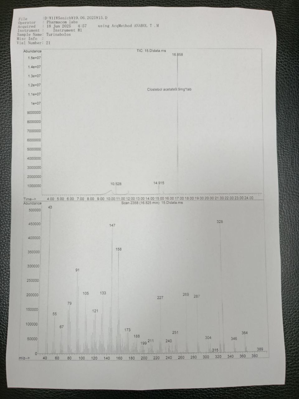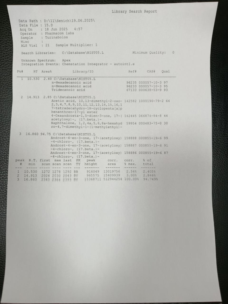“Pharmacom Labs ” TURINABOLOS The sample is white tablets. In which the active ingredient Chlorodehydromethyltestosterone is declared to be 10 mg/tab. 1) Chromatography: Chlorodehydromethyltestosterone does not contain sample!!! CONTAINS CLOSTEBOL ACETATE!!! 2) Mass spectrometry: the active ingredient content in the sample is ~ 9,9 mg/tab 3) Foreign impurities: ACETIC ACID FOUND!!!