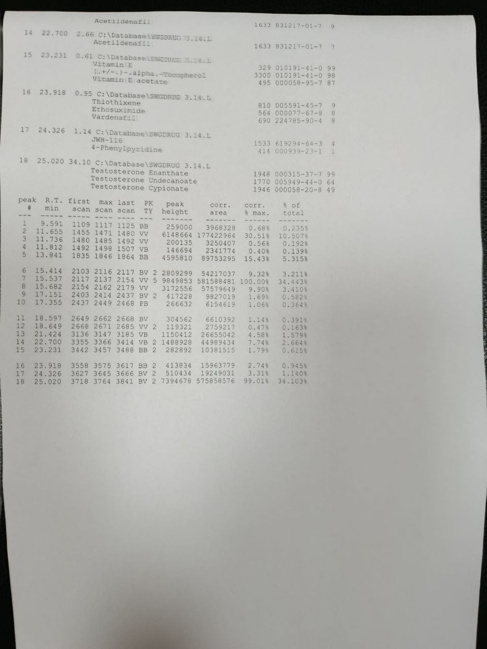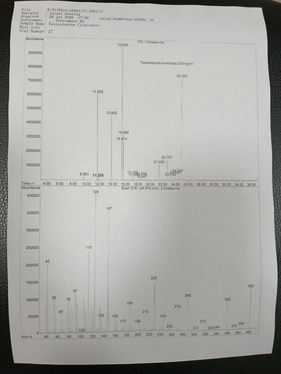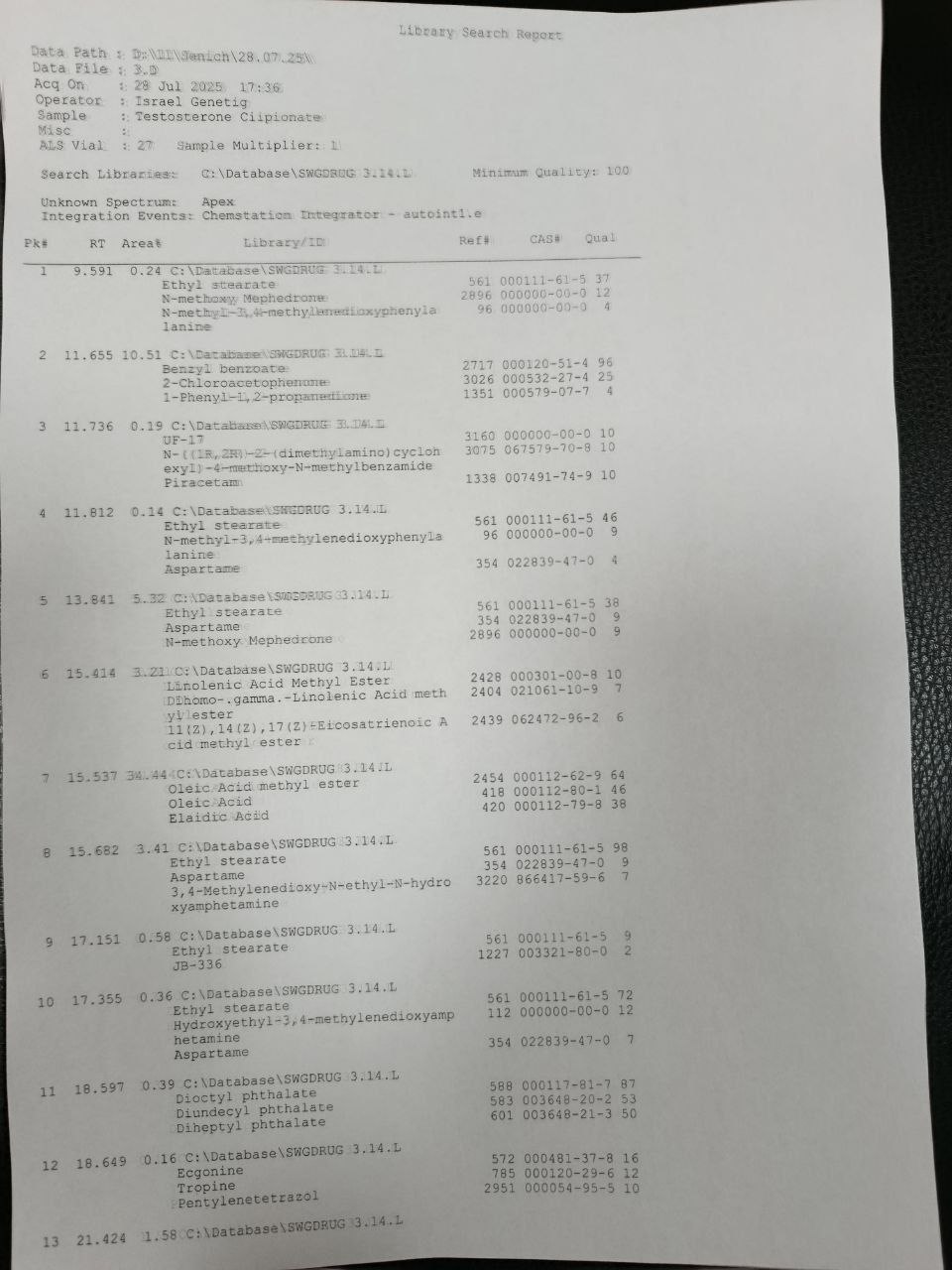 "Israel Genetic" TESTOSTERONE CYPIONATE The sample is a 10ml vial. 1) Chromatography: THE SAMPLE DOES NOT CONTAIN TESTOSTERONE CYPIONATE!!! CONTAINS TESTOSTERONE ENANTHATE!!! 2) Mass spectrometry: the active substance contained in the sample is ~200mg/ml. 3) Foreign impurities: FOUND UF-17 (hydrochloride)!!! CHEMICAL DIOCTYL PHTHALATE FOUND!!! SUBSTANCE ECGONINE FOUND!!! ACETYLDENAFIL FOUND!!! VITAMIN E FOUND!!! NEUROLEPTIC THIOTHIXENE FOUND!!! SYNTHETIC LIGAND JWH-116 FOUND!!!