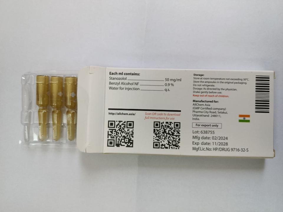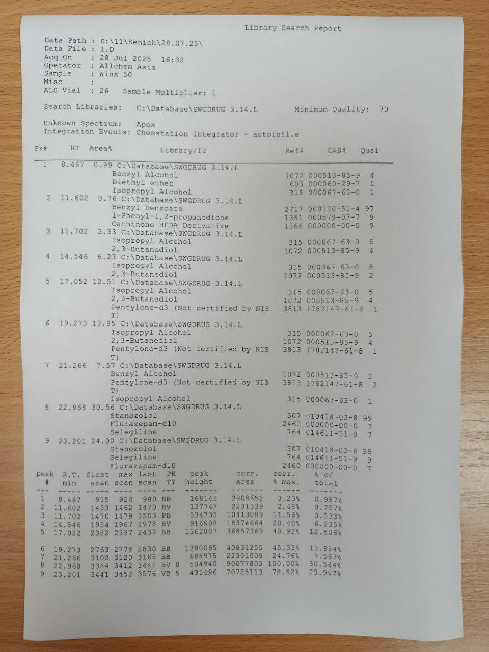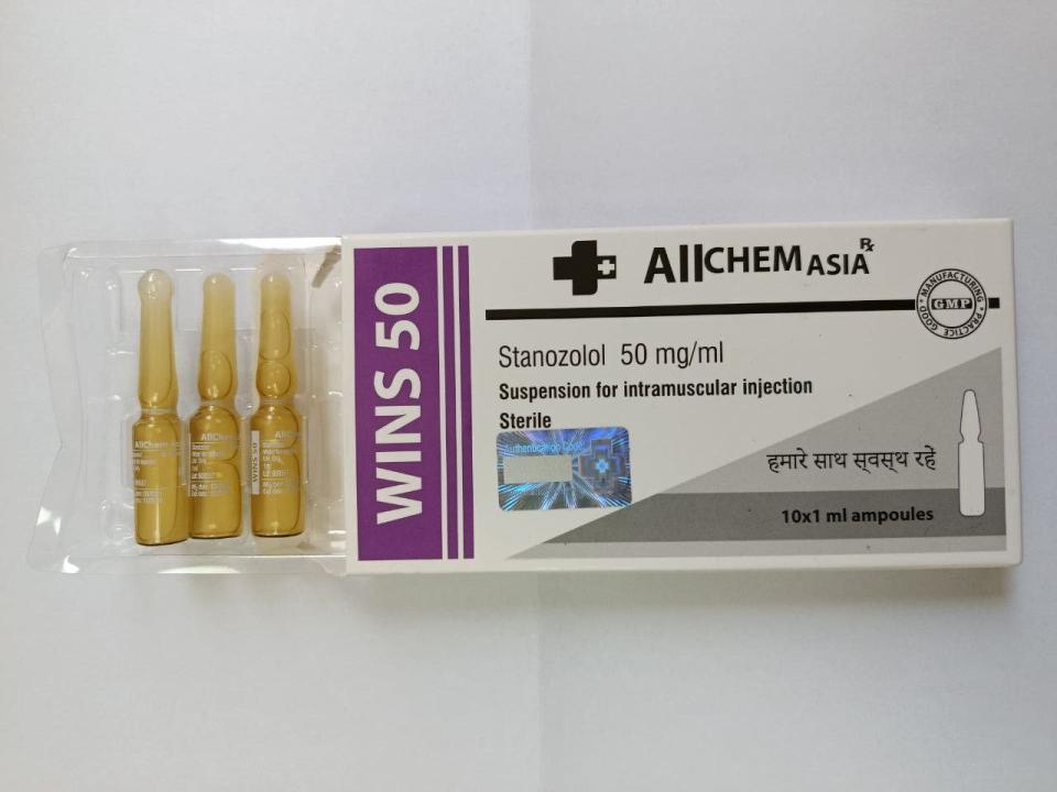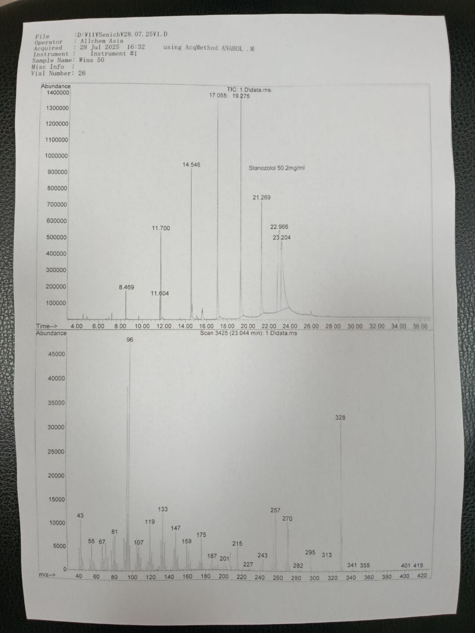 “AllChem Asia” WINS-50 Lot: 638755 The sample is 1 ml ampoules. In which the active substance Testosterone Stanozolol is declared 50mg/ml. 1) Chromatography: the sample contains Stanozolol. 2) Mass spectrometry: the content of active substance in the sample is ~50.2 mg/ml. 3) Foreign impurities: NOT DETECTED