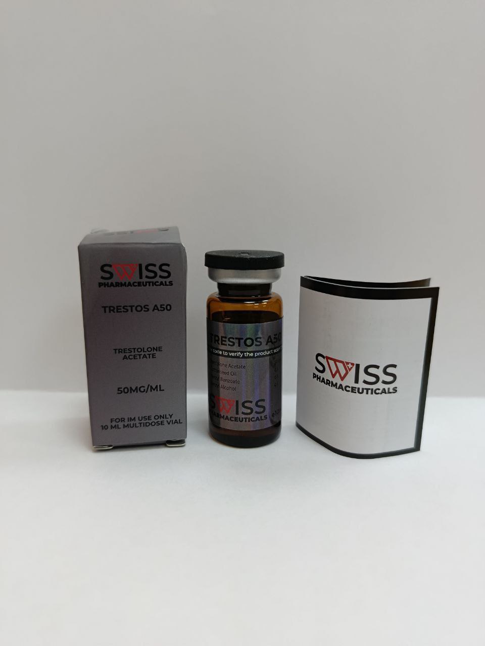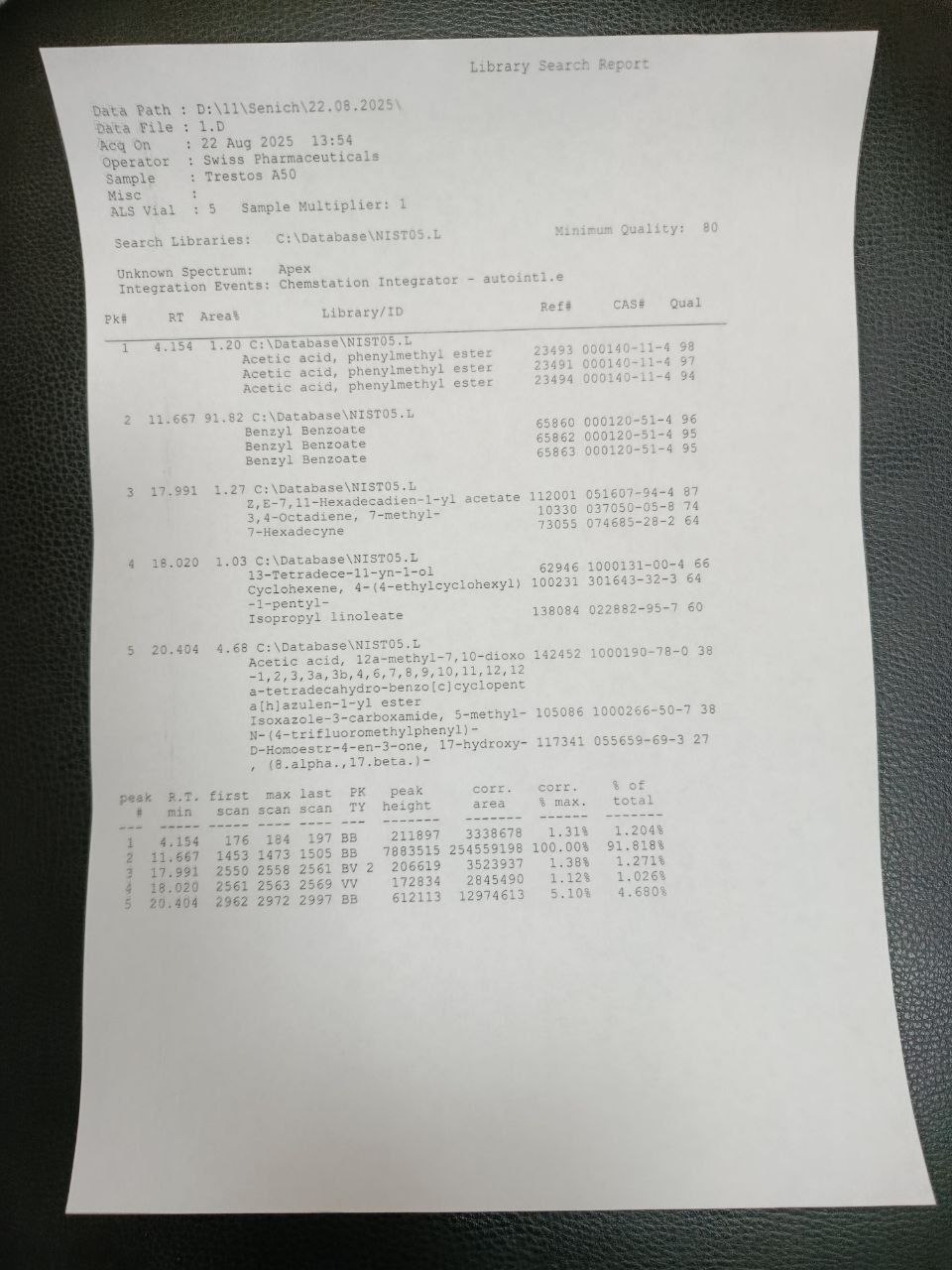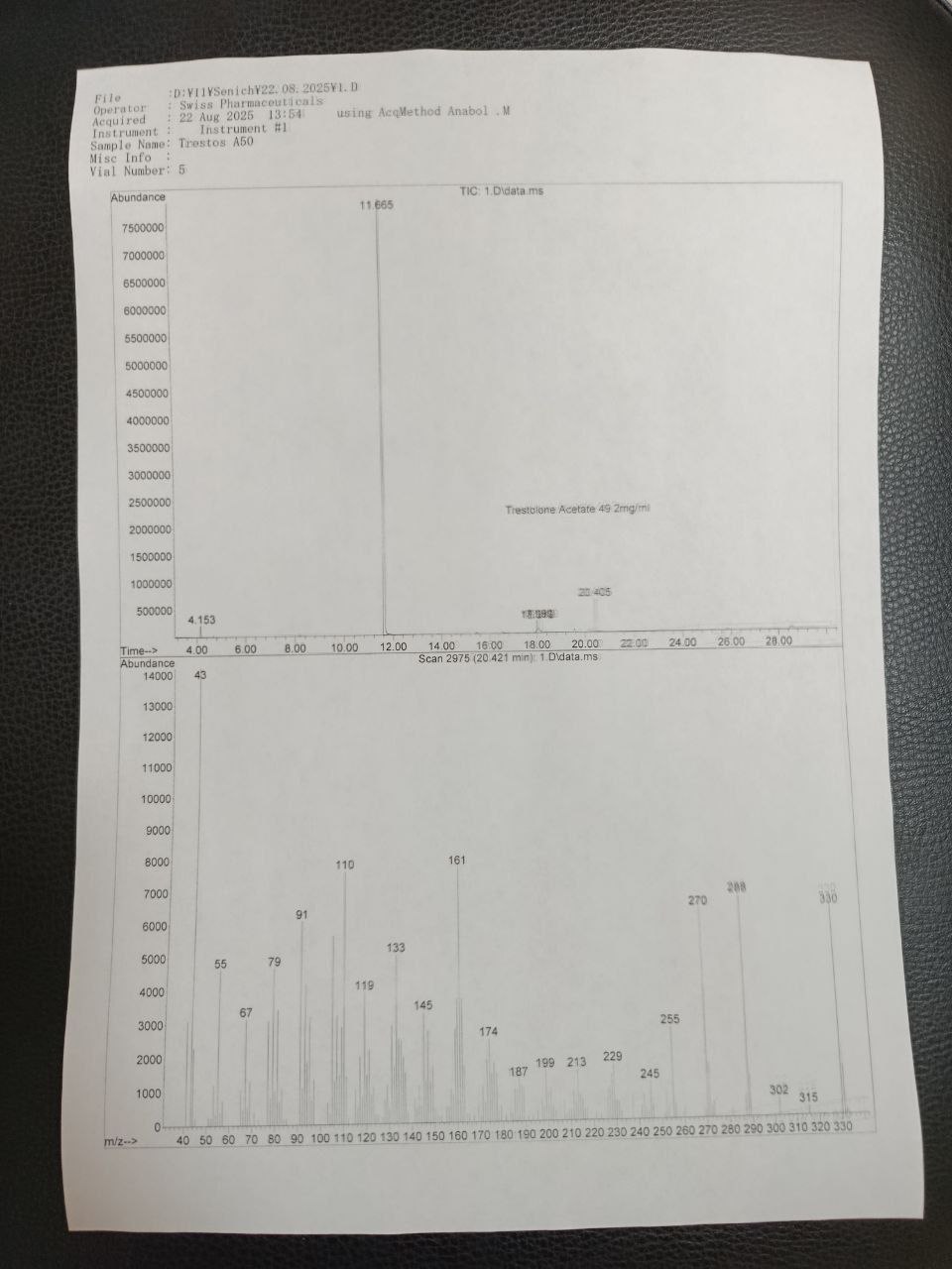 "Swiss Pharmaceuticals" TRESTOS A50 The sample is a 10ml vial. In which the active substance Trestolone Acetate is declared 50mg/ml. 1) Chromatography: the sample contains Trestolone Acetate 2) Mass spectrometry: the active substance contained in the sample is ~49.2mg/ml. 3) Foreign impurities: PINK PHEROMONE FOUND!!!