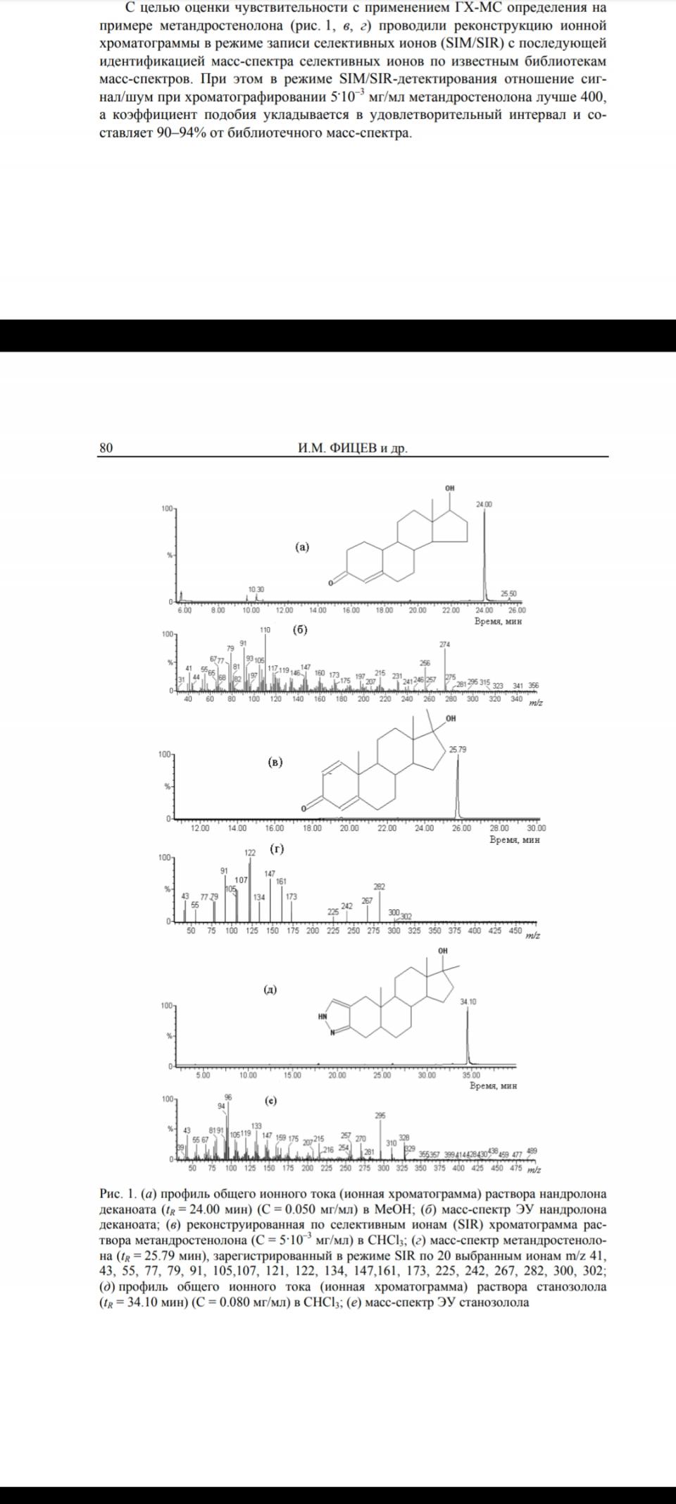 Я именно тот кто делал ввшеприведенное исследование. И категорически не согласен с вашими доводами. Хочу отметить тот факт что не с проведенным исследованием а именно с тем какую ерунду вы говорите. Ну во-первых растворители не находят пики и не "работают", они никаким образом не влияют на время выхода. Они лишь растворчют. Их задача забрать действующее вещество из носителя - масла, таблетки. А при начале анализа они сразу же удаляются т.к. это в основном легко летучие жидкости, а температура а инжекторе прибора высокая. Мы эти растворители порой даже на хроматограмме не видим. И нет разницы хлороформ, этанол, хлористый метил, четырех хлористый углерод или обычный этиловый спирт. Главное чтобы все вещество перешло в растворитель, а затем попало в прибор. Некорректно сравнивать время выхода на различных приборах т.к. может быть различная длинна колонки, в которой разделяется смесь. А если увеличить скорость потока то как вы и говорите деку можно увидеть на 25 минуте, а стан например на 35. Но это в разных анализах. А в одном исследовании если тест пропионат идёт перед деканоатом, то добиться того чтобы деканоат вышел перед пропионатом никак нельзя. Так и с тест Фенилпропионатом, он выходит после деканоат, а в вашем исследовании анализ заканчивается сразу же после выхода деканоат. |
