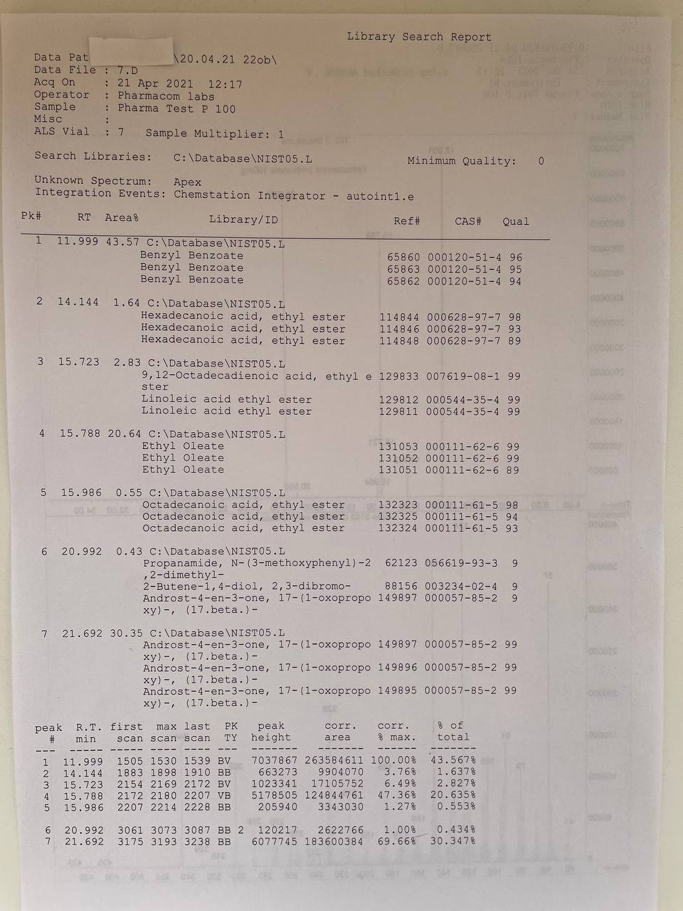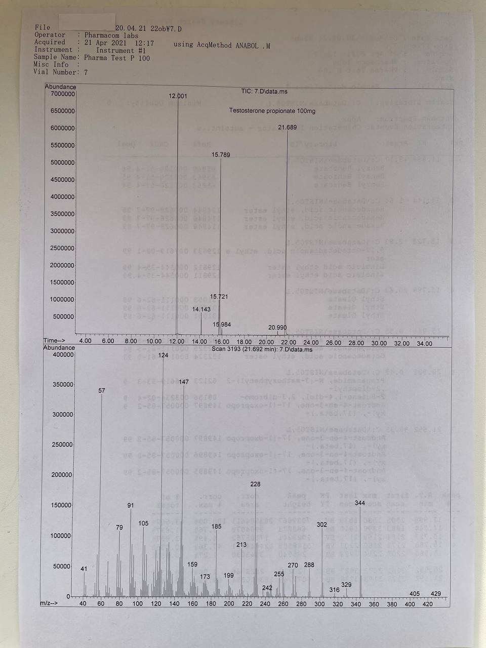“Pharmacom Labs” PHARMA TEST P100 Образец представляет собой виалу объёмом 10мл. В которой ДВ Тестостерон Пропионат заявлено 100мг/мл. 1) Хроматография: образец содержит Тестостерон Пропионат. 2) Масс-спектрометрия: содержание ДВ в образце ~100мг/мл. 3)Посторонние примеси: НЕ ОБНАРУЖЕНЫ
