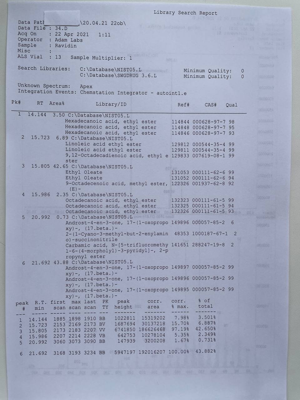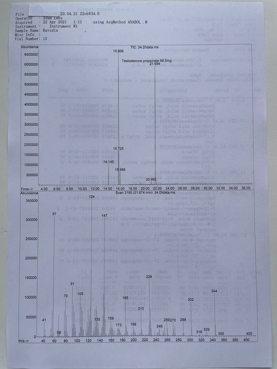 “Adam Labs” RAVIDIN Образец представляет собой виалу объёмом 10мл. В которой ДВ Тестостерон Пропионат заявлено 100мг/мл. 1) Хроматография: образец содержит Тестостерон Пропионат. 2) Масс-спектрометрия: содержание ДВ в образце ~99.5мг/мл. 3)Посторонние примеси: НЕ ОБНАРУЖЕНЫ