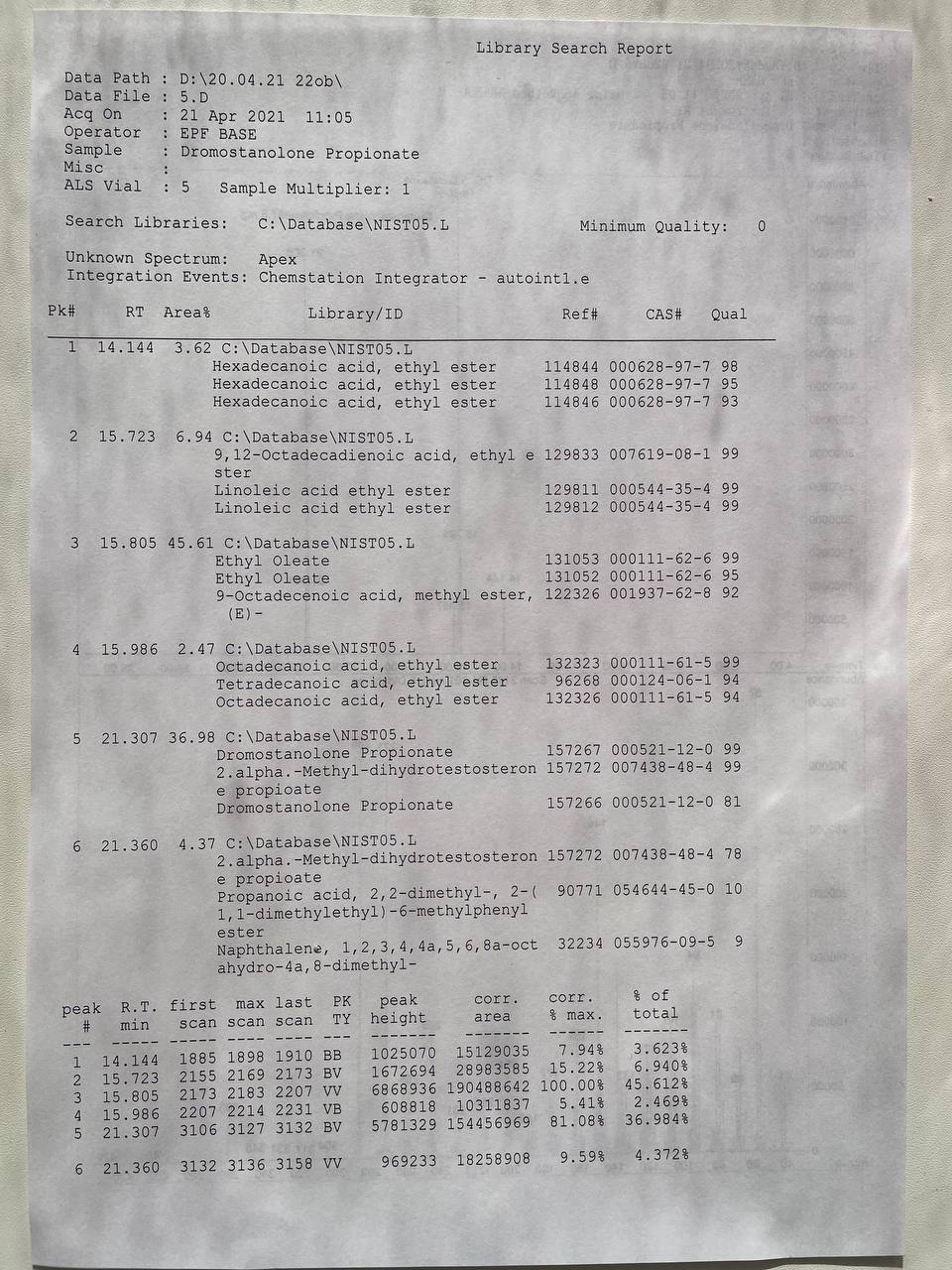 “Europrime Farmaceuticals SRL” MASTOGED BASE Образец представляет собой виалу объёмом 10мл. В которой ДВ Дростанолон Пропионат заявлено 100мг/мл. 1) Хроматография: образец содержит Дростанолон Пропионат. 2) Масс-спектрометрия: содержание ДВ в образце ~97.5мг/мл. 3)Посторонние примеси: НЕ ОБНАРУЖЕНЫ