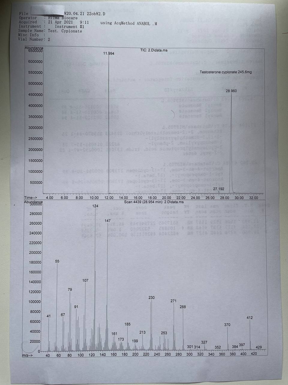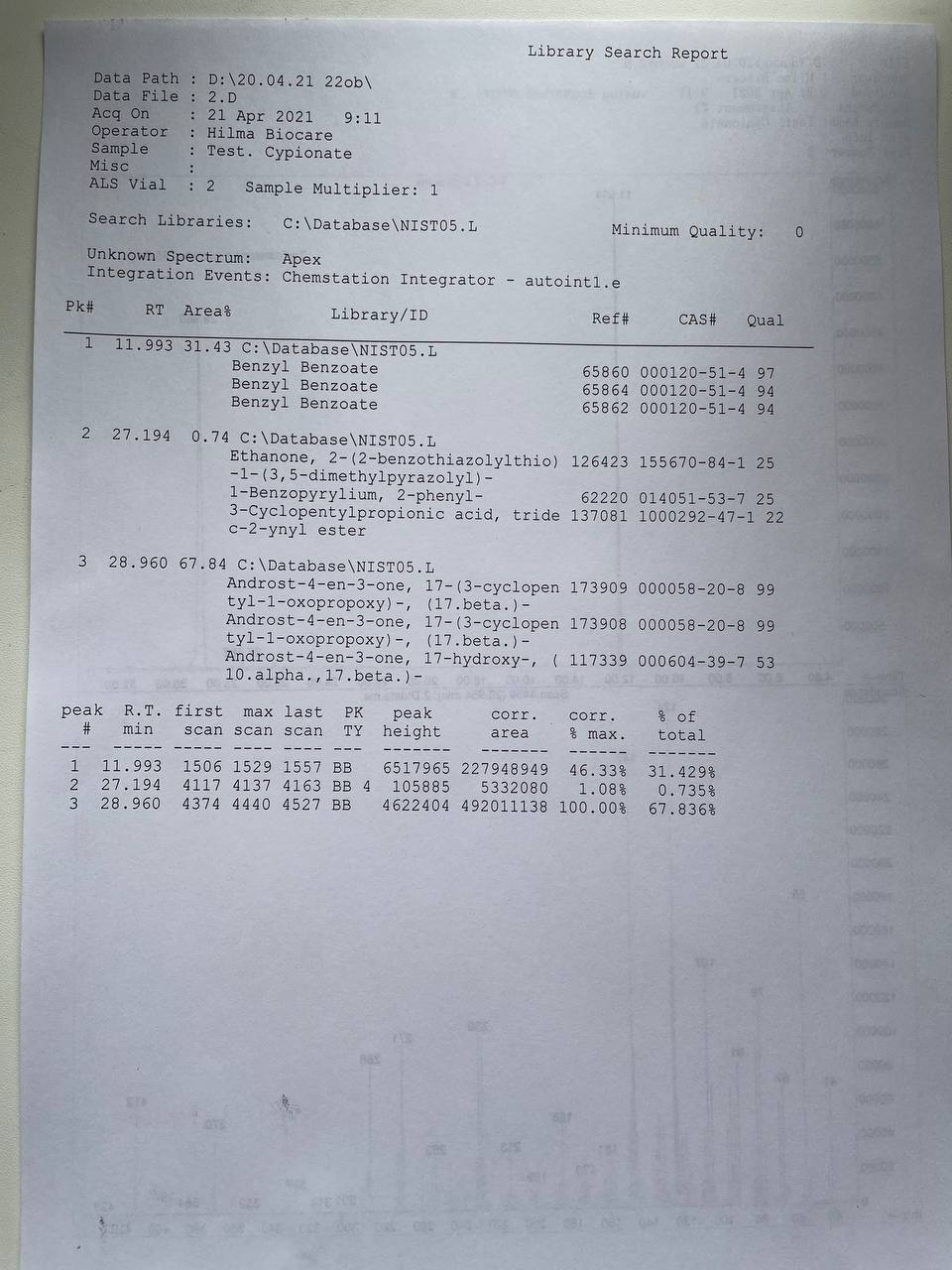 “Hilma Biocare” TESTOSTERONE CYPIONATE Образец представляет собой виалу объёмом 10мл. В которой ДВ Тестостерон Ципионат заявлено 250мг/мл. 1) Хроматография: образец содержит Тестостерон Ципионат. 2) Масс-спектрометрия: содержание ДВ в образце ~245.6мг/мл. 3)Посторонние примеси: Обнаружены следы Этанола.