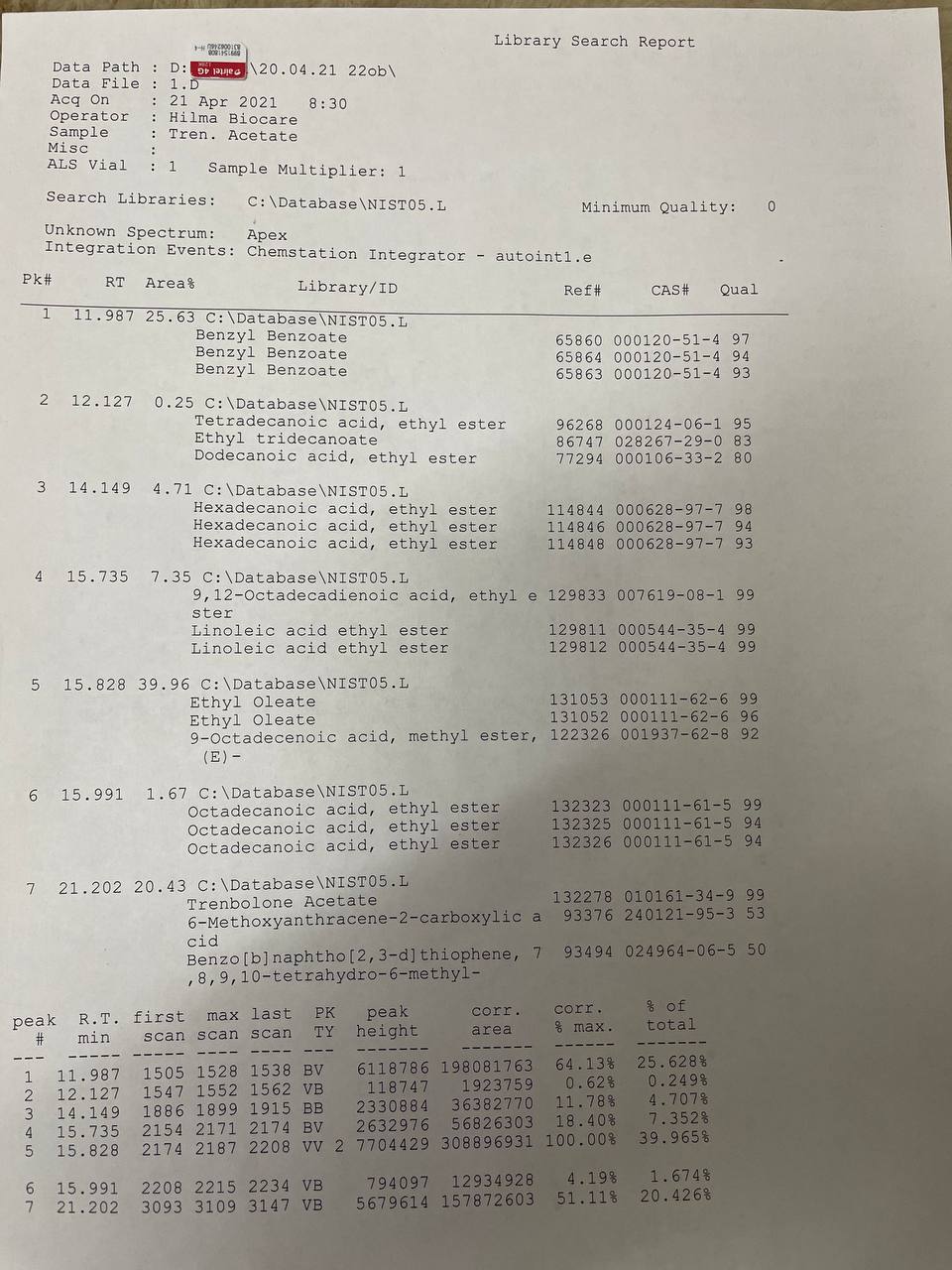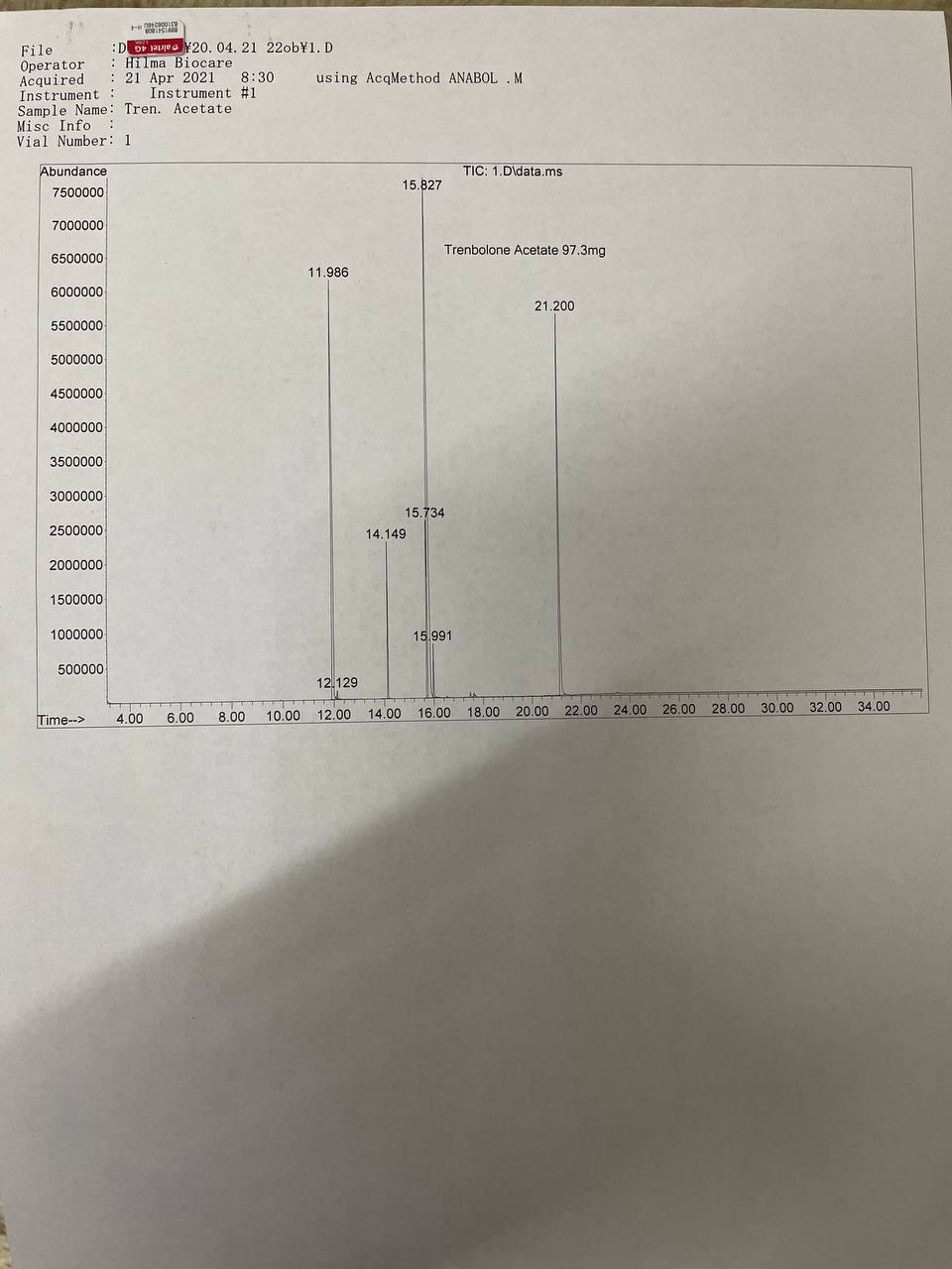 “Hilma Biocare” TRENBOLONE ACETATE Образец представляет собой виалу объёмом 10мл. В которой ДВ Тренболон Ацетат заявлено 100мг/мл. 1) Хроматография: образец содержит Тренболон Ацетат. 2) Масс-спектрометрия: содержание ДВ в образце ~97.3мг/мл. 3)Посторонние примеси: НЕ ОБНАРУЖЕНЫ