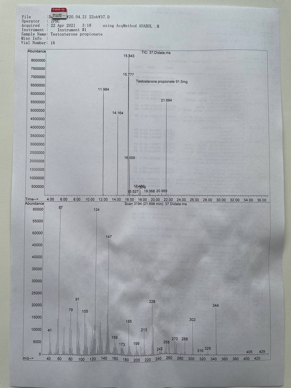 TESTOSTERONE PROPIONATE Образец представляет собой ампулы объёмом 2мл. В которой ДВ Тестостерон Пропионат заявлено 100мг/мл. 1) Хроматография: образец содержит Тестостерон Пропионат. 2) Масс-спектрометрия: содержание ДВ в образце ~91.5мг/мл. 3)Посторонние примеси: НЕ ОБНАРУЖЕНЫ