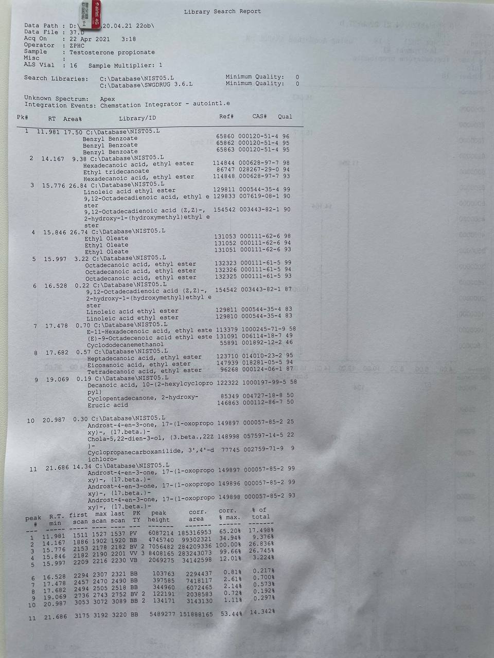 «Zhengzhou Pharmaceuticals” TESTOSTERONE ENANTHATE Образец представляет собой ампулы объёмом 2мл. В которых ДВ заявлено Тестостерон Энантат 250мг/мл. 1) Хроматография: образец содержит Тестостерон Энантат. 2) Масс-спектрометрия: содержание ДВ в образце ~241.2мг/мл. 3)Посторонние примеси: Обнаружены Алкены.
