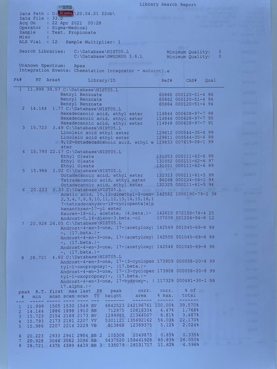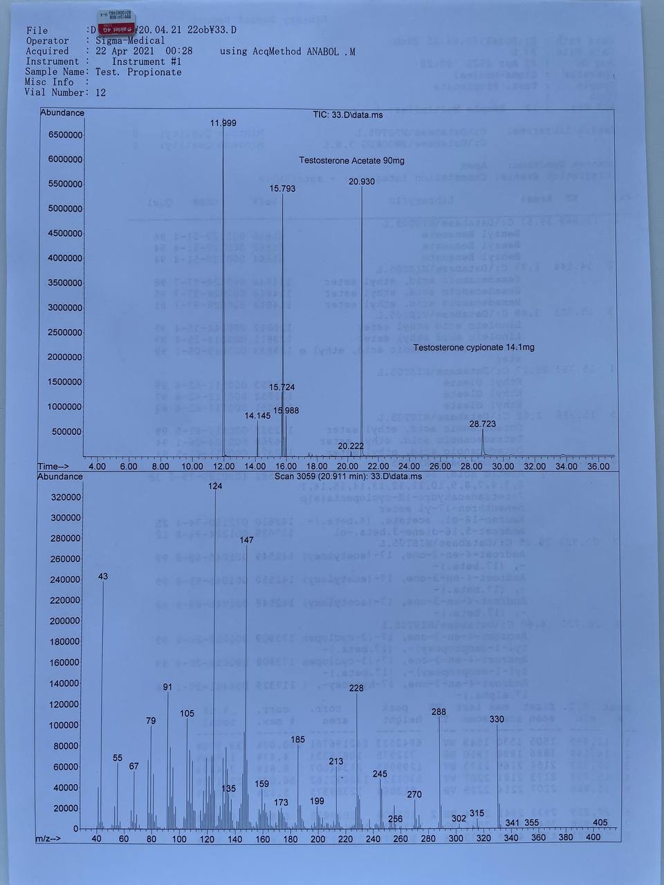 «Sigma-Medical” TESTOSTERONE PROPIONATE Образец представляет собой ампулы. В который ДВ заявлено Тестостерон Пропионат 100мг/мл. 1) Хроматография: образец: НЕ СОДЕРЖИТ Тестостерон Пропионат. 2) Масс-спектрометрия: Тестостерон Ацетат 90мг/мл Тестостерон Ципионат 14.1мг/мл Общее содержание ДВ в образце ~104.1мг/мл. 3)Посторонние примеси: НЕ ОБНАРУЖЕНЫ