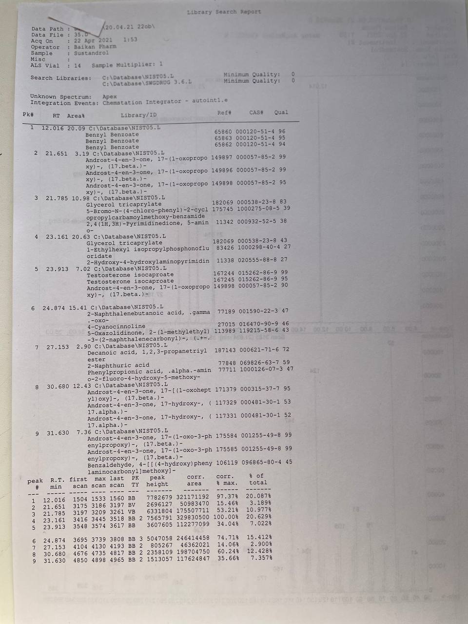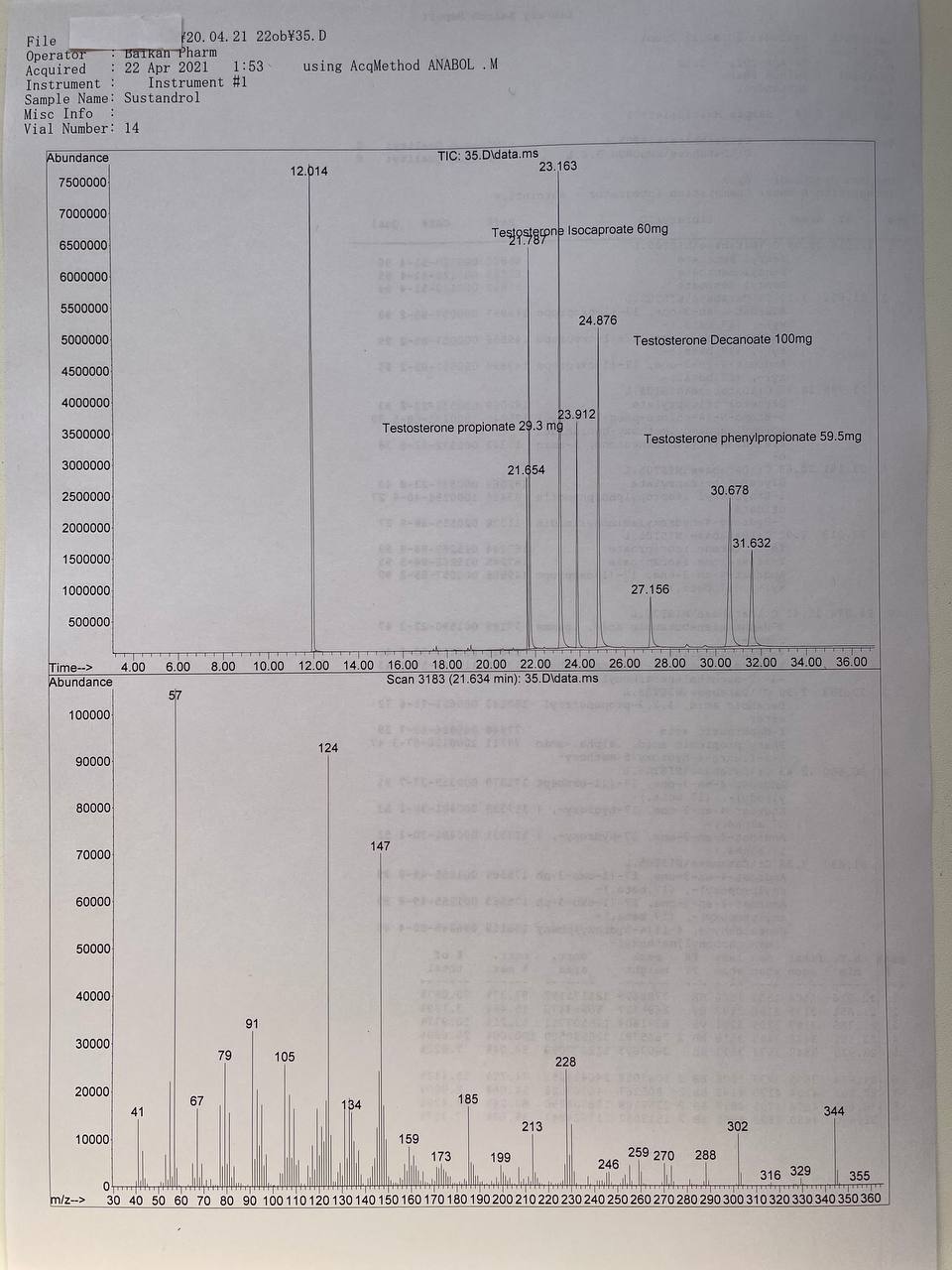 “Balkan Pharmaceuticals” SUSTANDROL Образец представляет собой ампулу. В которой заявлено смесь 4-х эфиров Тестостерона 250мг/мл. 1) Хроматография: образец содержит: Тестостерон Пропионат Тестостерон Изокапроат Тестостерон Фенилпропионат Тестостерон Деканоат 2) Масс-спектрометрия: содержание ДВ в образце: Тест. Пропионат-29.3мг/мл Тест. Фенилпропионат-59.5мг/мл Тест. Изокапроат-60мг/мл Тест. Деканоат-100мг/мл Содержание ДВ в образце ~248.8мг/мл. 3) Посторонние примеси: НЕ ОБНАРУЖЕНЫ.