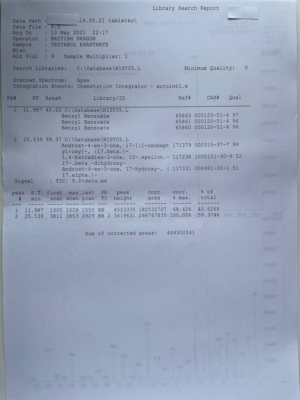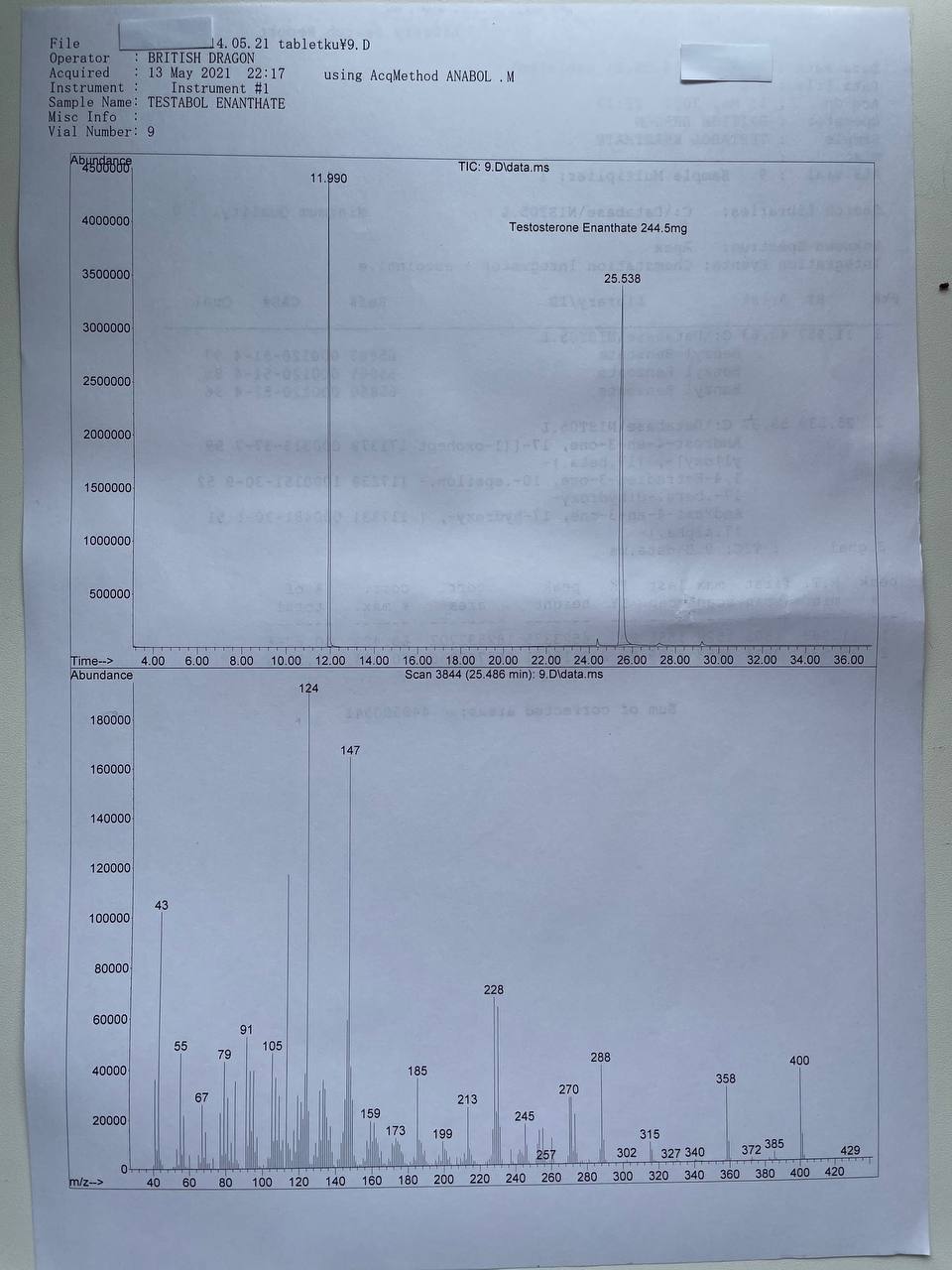 «British Dragon» TESTABOL ENANTHATE Образец представляет собой виалу объёмом 10мл. В который ДВ заявлено Тестостерон Энантат 250мг/мл 1) Хроматография: образец содержит Тестостерон Энантат. 2) Масс-спектрометрия: содержание ДВ в образце ~244.5мг/мл. 3)Посторонние примеси: НЕ ОБНАРУЖЕНЫ.