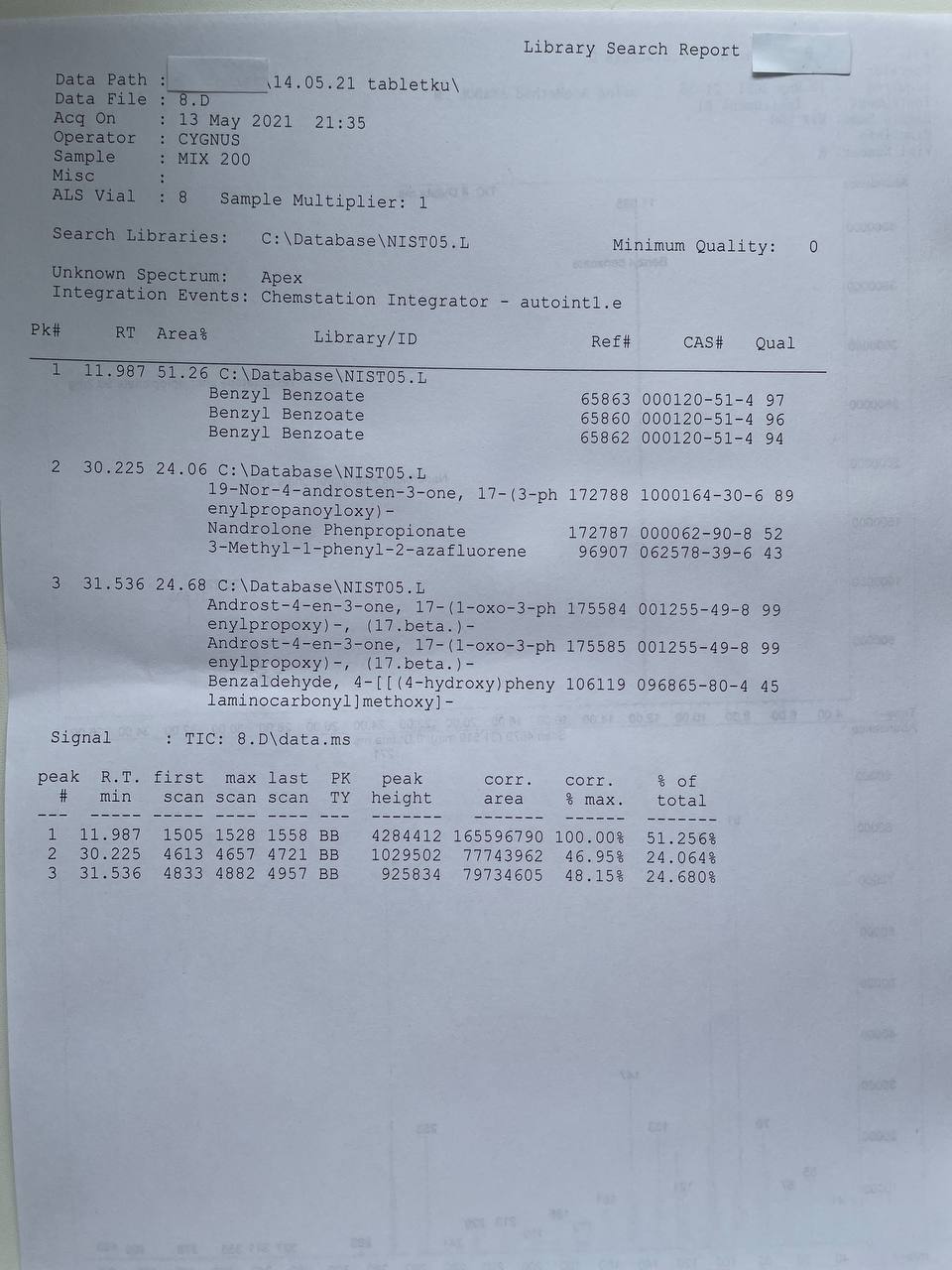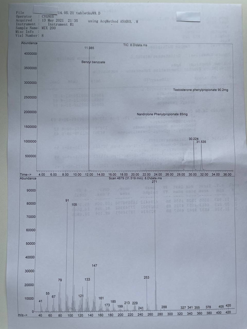 “Cygnus Pharmaceutical Croup” MIX - 200 Партия 07/2025 Образец представляет собой виалу объёмом 10мл. В которых ДВ 2-х эфиров: Нандролон Фенилпропионат Тестостерон Фенилпропионат В которых заявлено 200мг/мл. 1) Хроматография: образец содержит Нандролон Фенилпропионат Тестостерон Фенилпропионат 2) Масс-спектрометрия: содержание ДВ в образце Нандролон Фенилпропионат~85мг/мл Тестостерон Фенилпропионат~90.2мг/мл Общее содержание 175.2мг/мл 3) Посторонние примеси: НЕ ОБНАРУЖЕНЫ.