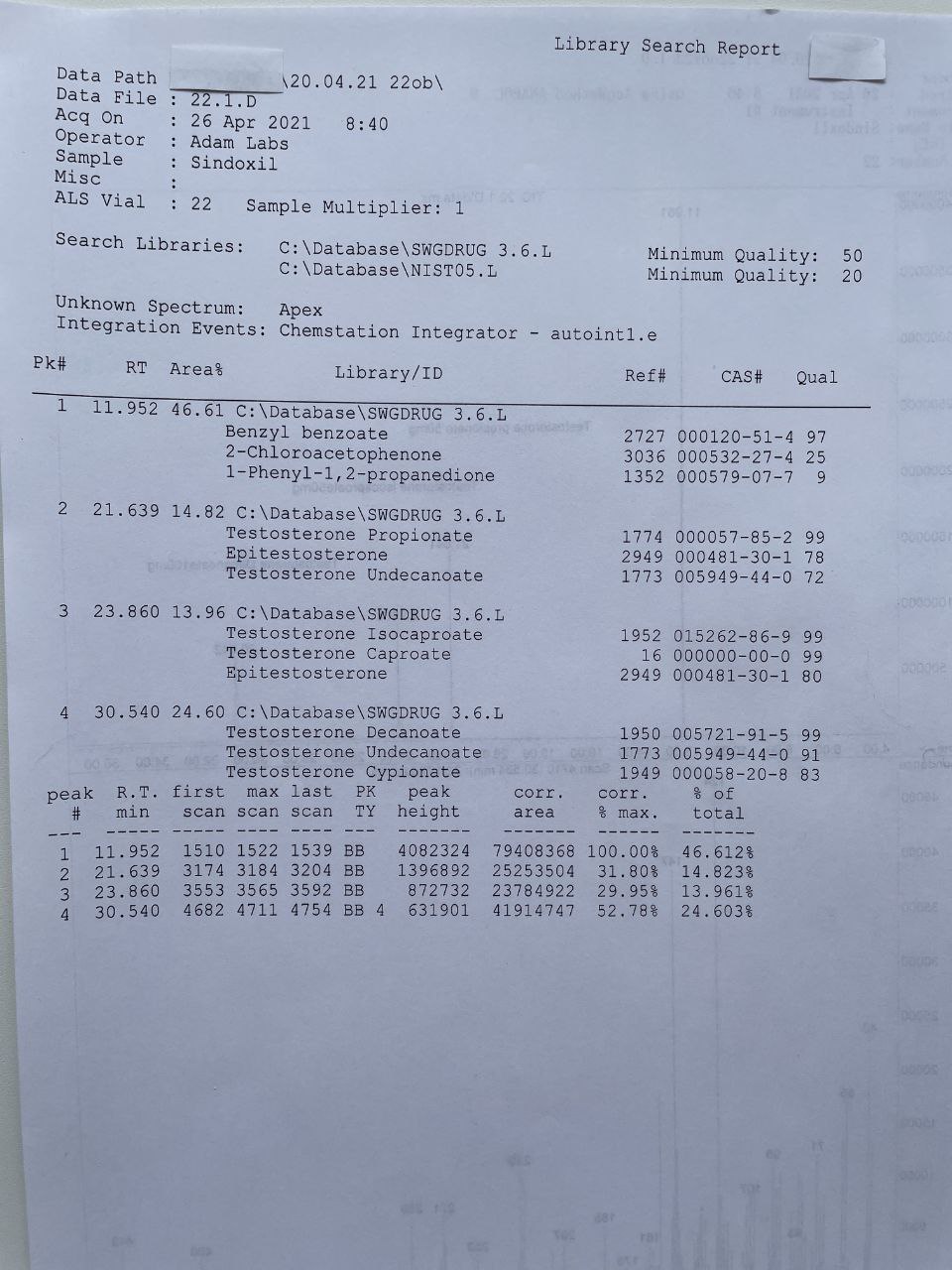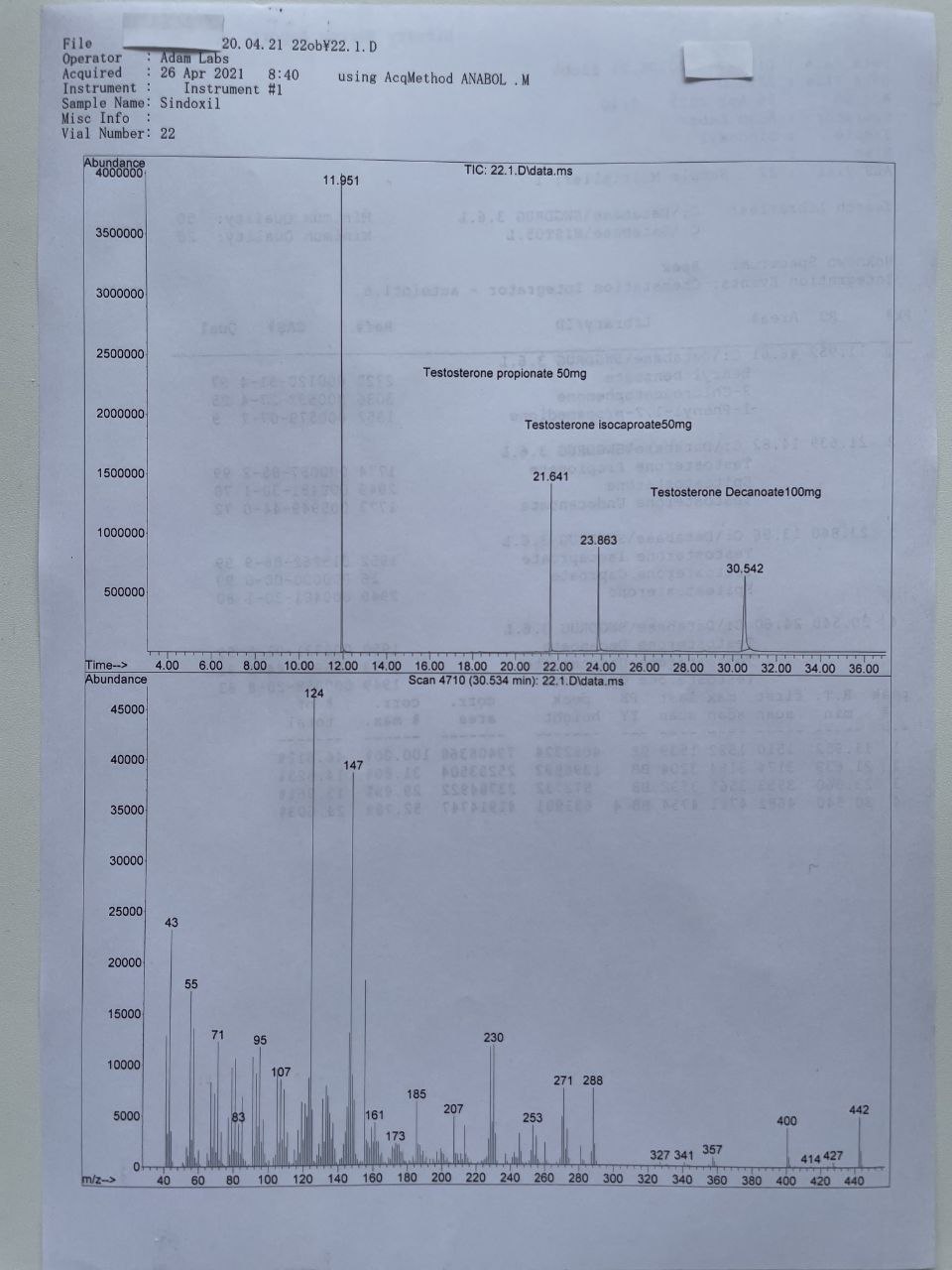 «Adam Labs” SINDOXIL Образец представляет собой ампулы, в которых ДВ 4-х эфиров Тестостерона. В которых заявлено 250мг/мл. 1) Хроматография: образец содержит: Тестостерон Пропионат Тестостерон Изокапроат Тестостерон Деканоат 2) Масс-спектрометрия: содержание ДВ в образце: Тест. Пропионат - 50мг/мл Тест. Изокапроат - 50мг/мл Тест. Деканоат - 100мг/мл P/S Тестостерон Фенилпропионат не выявлено. Общее содержание 200мг/мл. 3) Посторонние примеси: НЕ ОБНАРУЖЕНЫ.