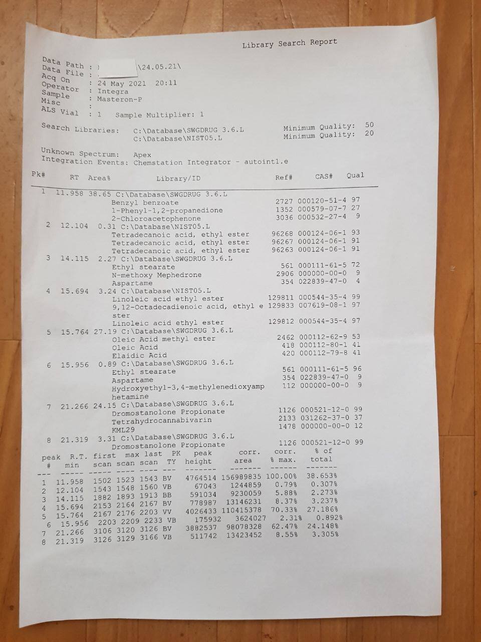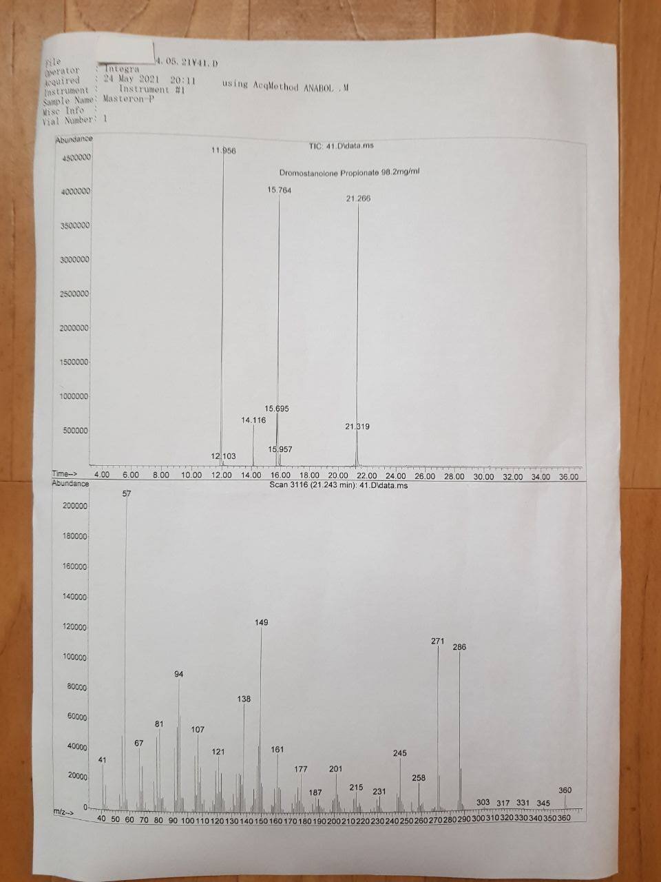 “Integra” MASTERON - P Образец представляет собой ампулы объёмом 1мл. В которой ДВ Дростанолон Пропионат заявлено 100мг/мл. 1) Хроматография: образец содержит Дростанолон Пропионат. 2) Масс-спектрометрия: содержание ДВ в образце ~98.2мг/мл. 3) Посторонние примеси: НЕ ОБНАРУЖЕНЫ