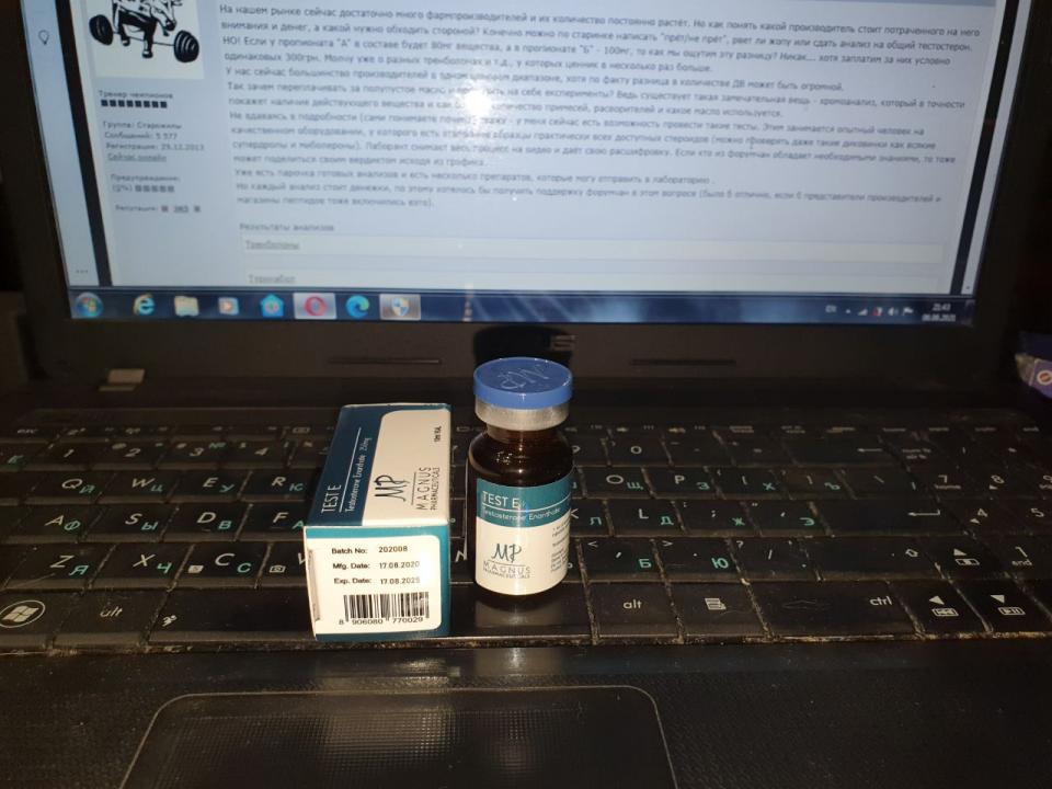«Magnus Pharmaceuticals» TEST E Образец представляет собой виалу объёмом 10мл. В которой ДВ заявлено Тестостерон Энантат 250мг/мл 1) Хроматография: образец содержит Тестостерон Энантат. 2) Масс-спектрометрия: содержание ДВ в образце ~248мг/мл. 3)Посторонние примеси: НЕ ОБНАРУЖЕНЫ