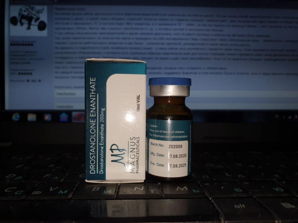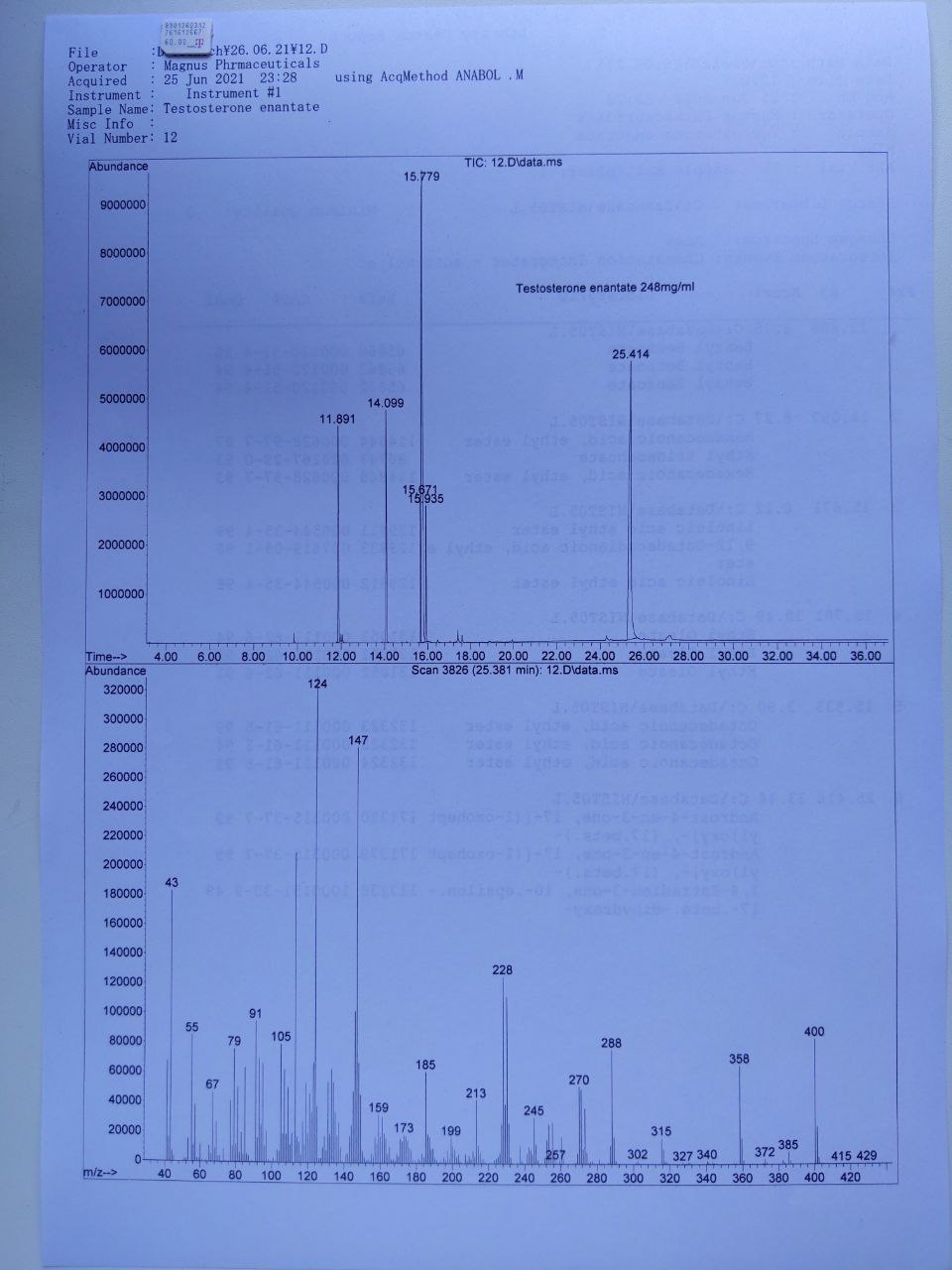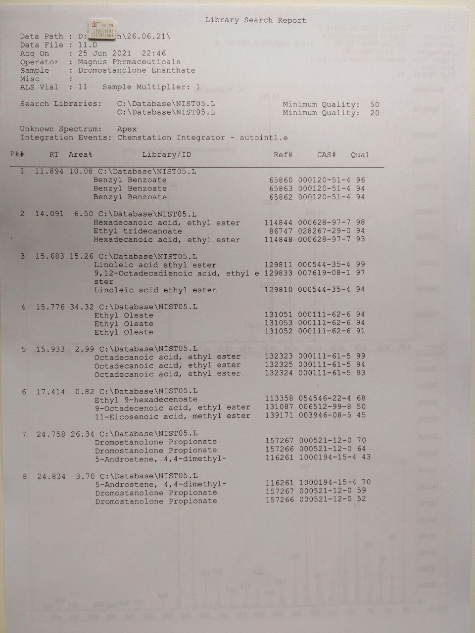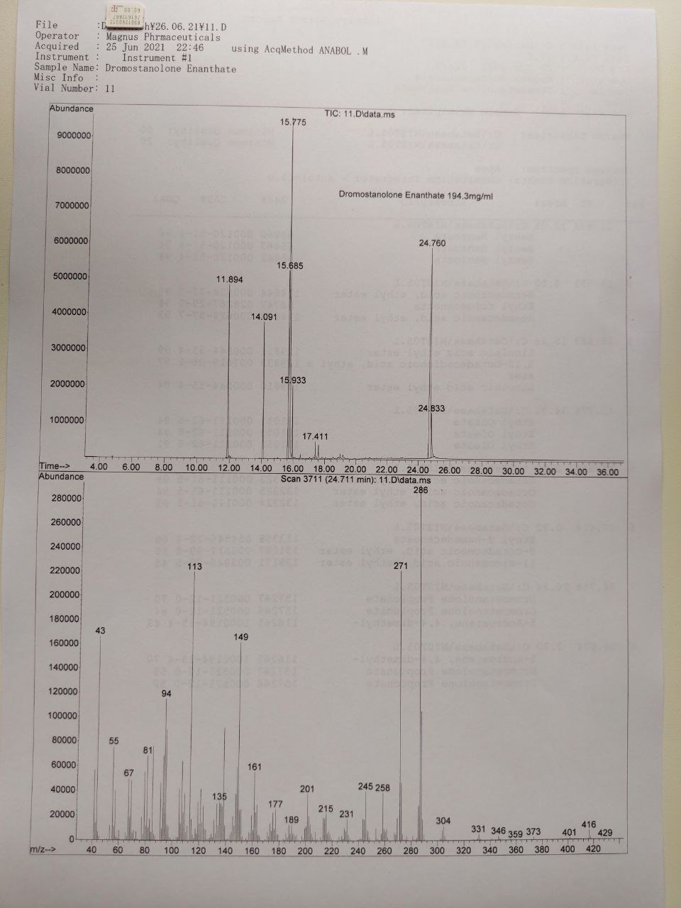 «Magnus Pharmaceuticals» DROSTANOLONE ENANTHATE Образец представляет собой виалу объёмом 10мл. В которой ДВ заявлено Дростанолон Энантат 200мг/мл 1) Хроматография: образец содержит Дростанолон Энантат. 2) Масс-спектрометрия: содержание ДВ в образце ~194.3мг/мл. 3)Посторонние примеси: НЕ ОБНАРУЖЕНЫ