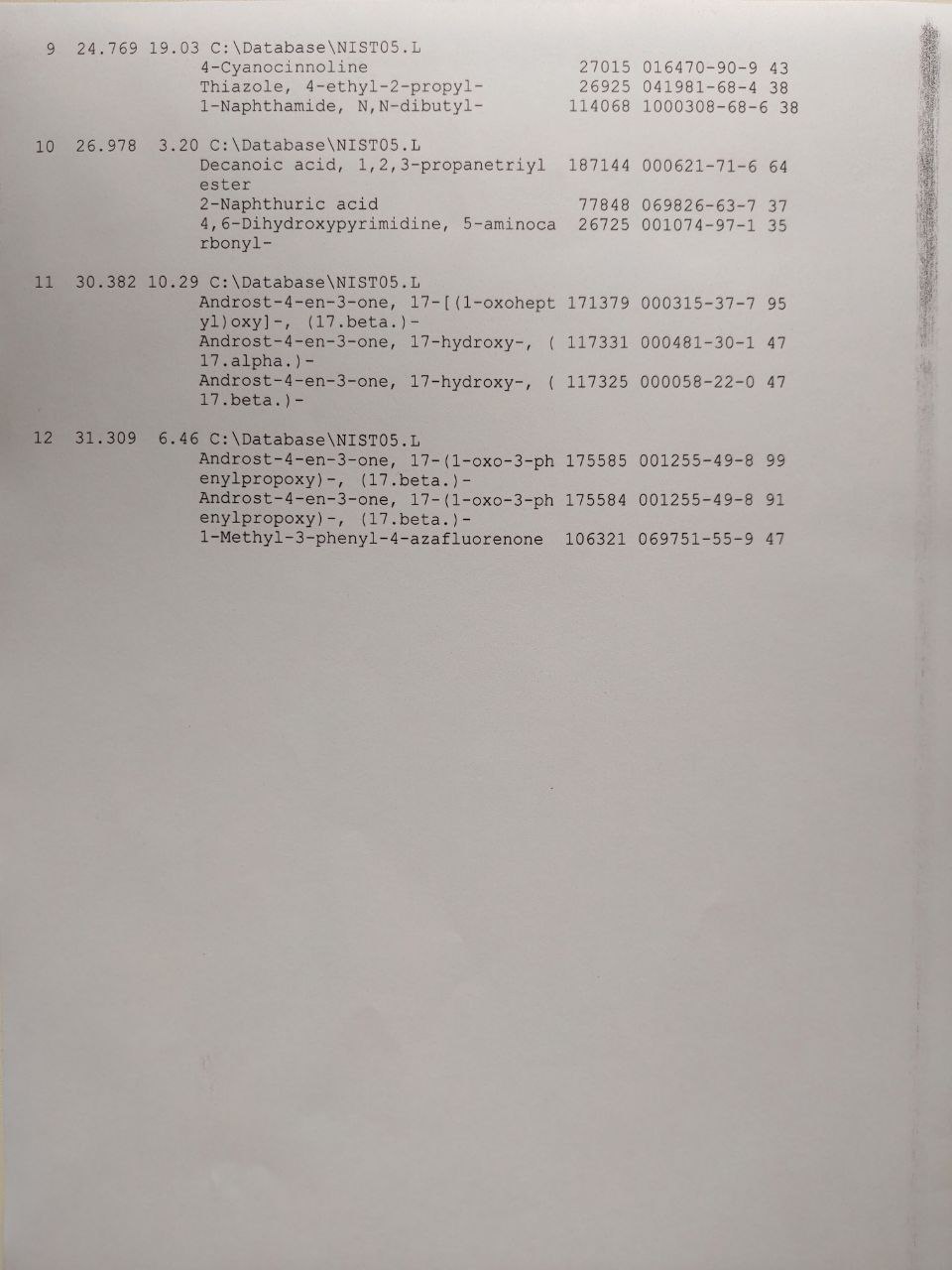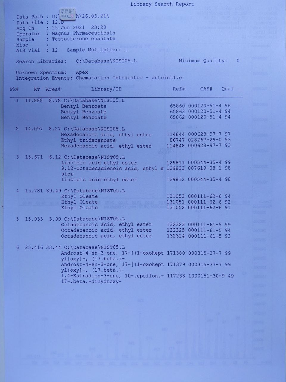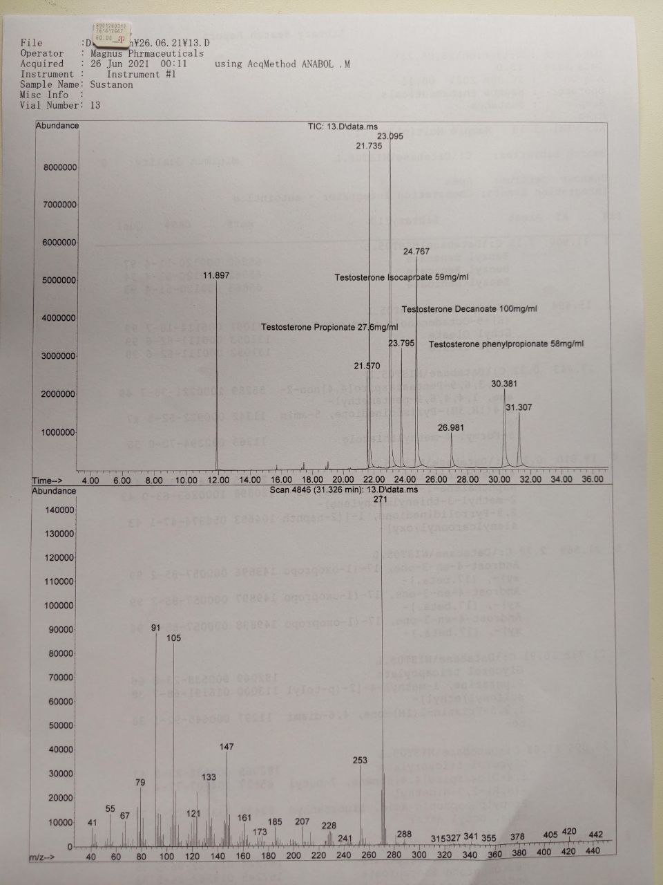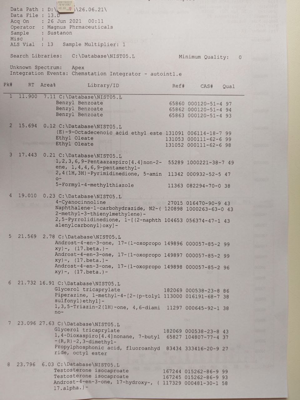 «Magnus Pharmaceuticals» SUSTANON 250 Образец представляет собой виалу объёмом 10мл. В которой заявлено смесь 4-х эфиров Тестостерона 250мг/мл. 1) Хроматография: образец содержит: Тестостерон Пропионат Тестостерон Изокапроат Тестостерон Фенилпропионат Тестостерон Деканоат 2) Масс-спектрометрия: содержание ДВ в образце: Тест. Пропионат-27.6мг/мл Тест. Фенилпропионат-58мг/мл Тест. Изокапроат-59мг/мл Тест. Деканоат-100мг/мл Содержание ДВ в образце ~244.6мг/мл. 3) Посторонние примеси: НАЙДЕН 1,4,4,6,9 ПЕНТАМЕТИЛ И ПРОМЕЖУТОЧНОЕ СОЕДИНЕНИЕ НАФТАЛИН-1-КАРБОГИДРАЗИД.