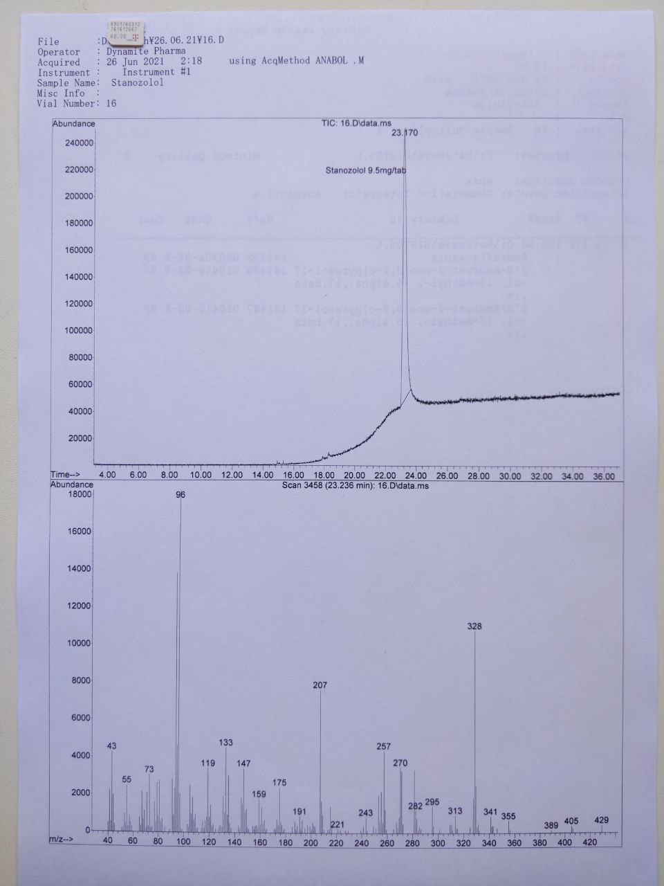 «Dynamite Pharma» STANOZOLOL Образец представляет собой таблетки белого цвета. В которых ДВ Станозолол заявлено 10мг/таб. 1) Хроматография: образец содержит Станозолол. 2) Масс-спектрометрия: содержание ДВ в образце ~9.5мг/таб. 3)Посторонние примеси: НЕ ОБНАРУЖЕНЫ.