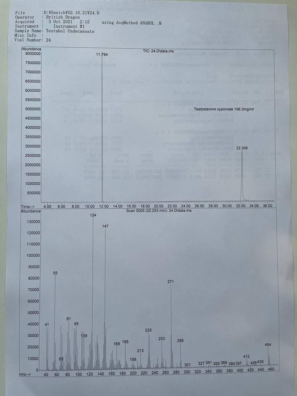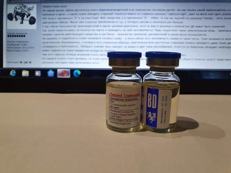 British Dragon TESTABOL UNDECANOATE Образец представляет собой виалу объёмом 10мл. В которой ДВ заявлено Тестостерон Ундеканоат 200мг/мл. 1) Хроматография: ОБРАЗЕЦ НЕ СОДЕРЖИТ ТЕСТОСТЕРОН УНДЕКАНОАТ! СОДЕРЖИТ ТЕСТОСТЕРОН ЦИПИОНАТ. 2) Масс-спектрометрия: содержание ДВ в образце ~196.3мг/мл. 3)Посторонние примеси: НЕ ОБНАРУЖЕНЫ