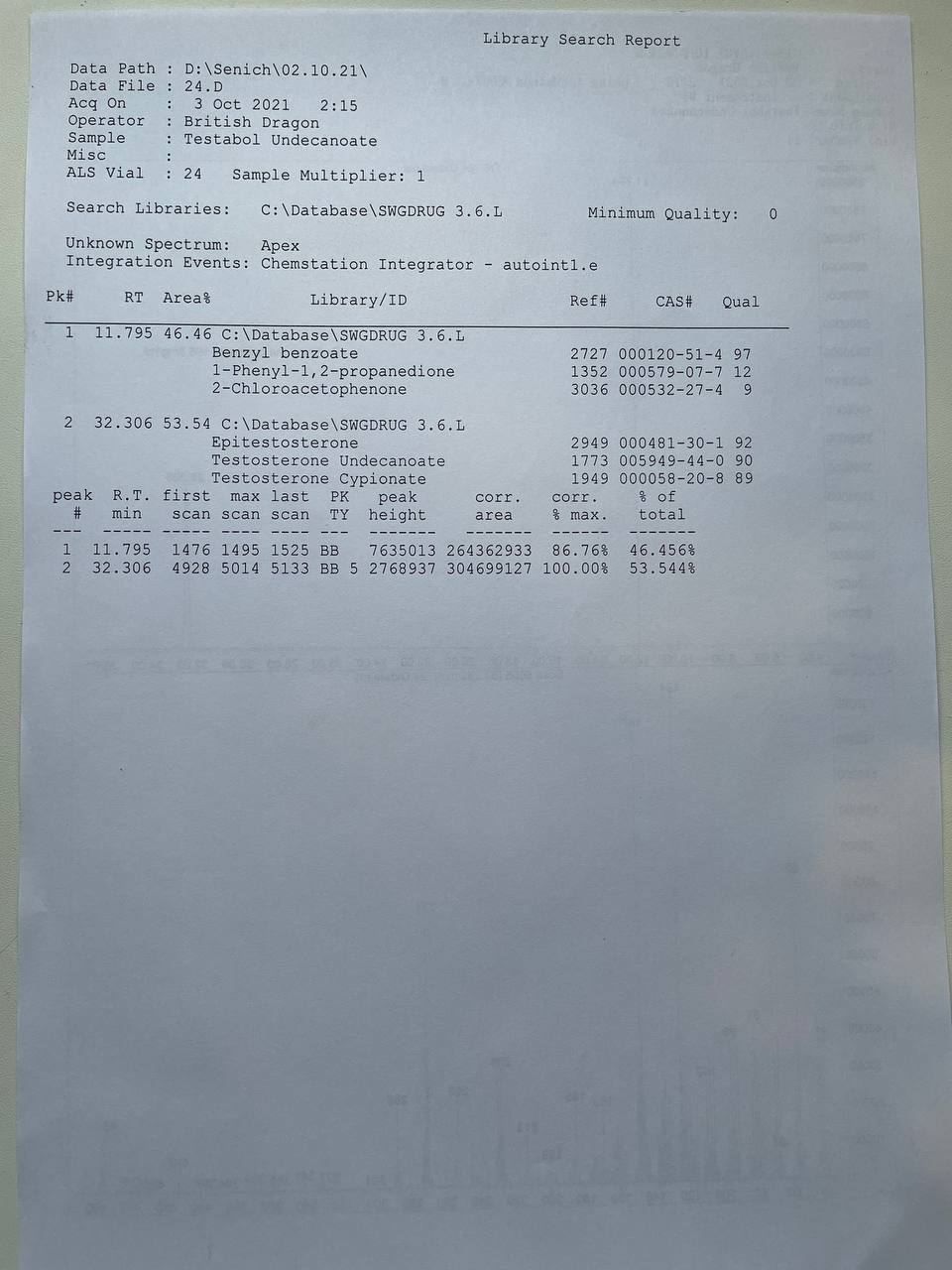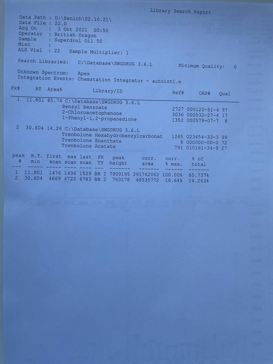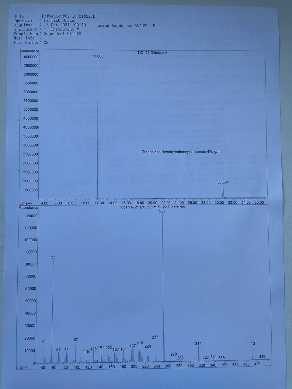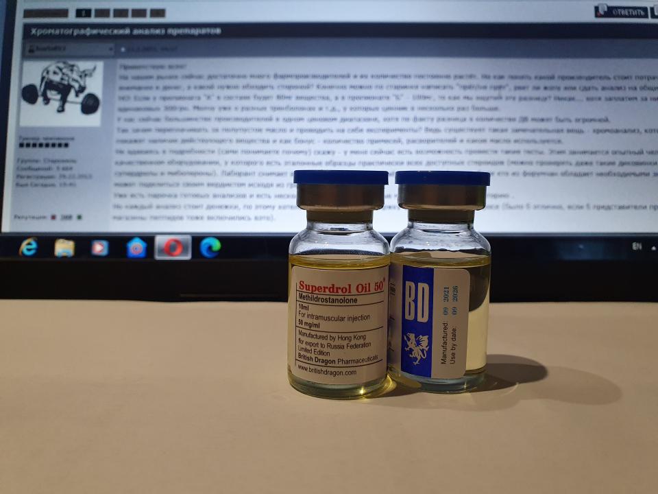 (От прямого производителя) British Dragon SUPERDROL OIL 50 Образец представляет собой виалу объёмом 10мл. В которой ДВ заявлено Метилдростанолон 50мг/мл. 1) Хроматография: образец НЕ СОДЕРЖИТ МЕТИЛДРОСТАНОЛОН! СОДЕРЖИТ ТРЕНБОЛОН ГЕКСАГИДРОБЕНЗИЛКАРБОНАТ 2) Масс-спектрометрия: содержание ДВ в образце ~47мг/мл. 3)Посторонние примеси: НЕ ОБНАРУЖЕНЫ