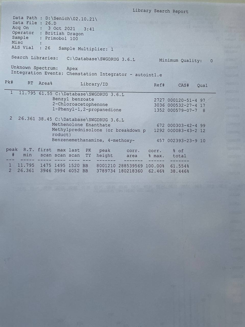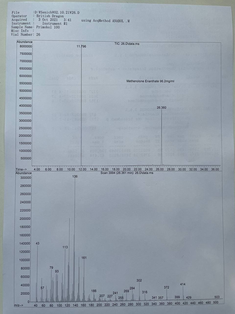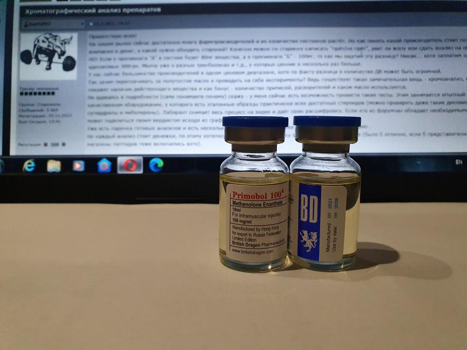 British Dragon PRIMOBOL 100 Образец представляет собой виалу объёмом 10мл. В которой ДВ заявлено Метенолон Энантат 100мг/мл. 1) Хроматография: образец содержит Метенолон Энантат. 2) Масс-спектрометрия: содержание ДВ в образце ~96.2мг/мл. 3)Посторонние примеси: НЕ ОБНАРУЖЕНЫ