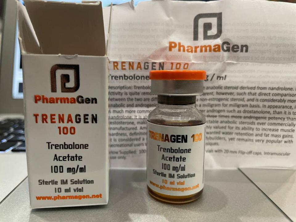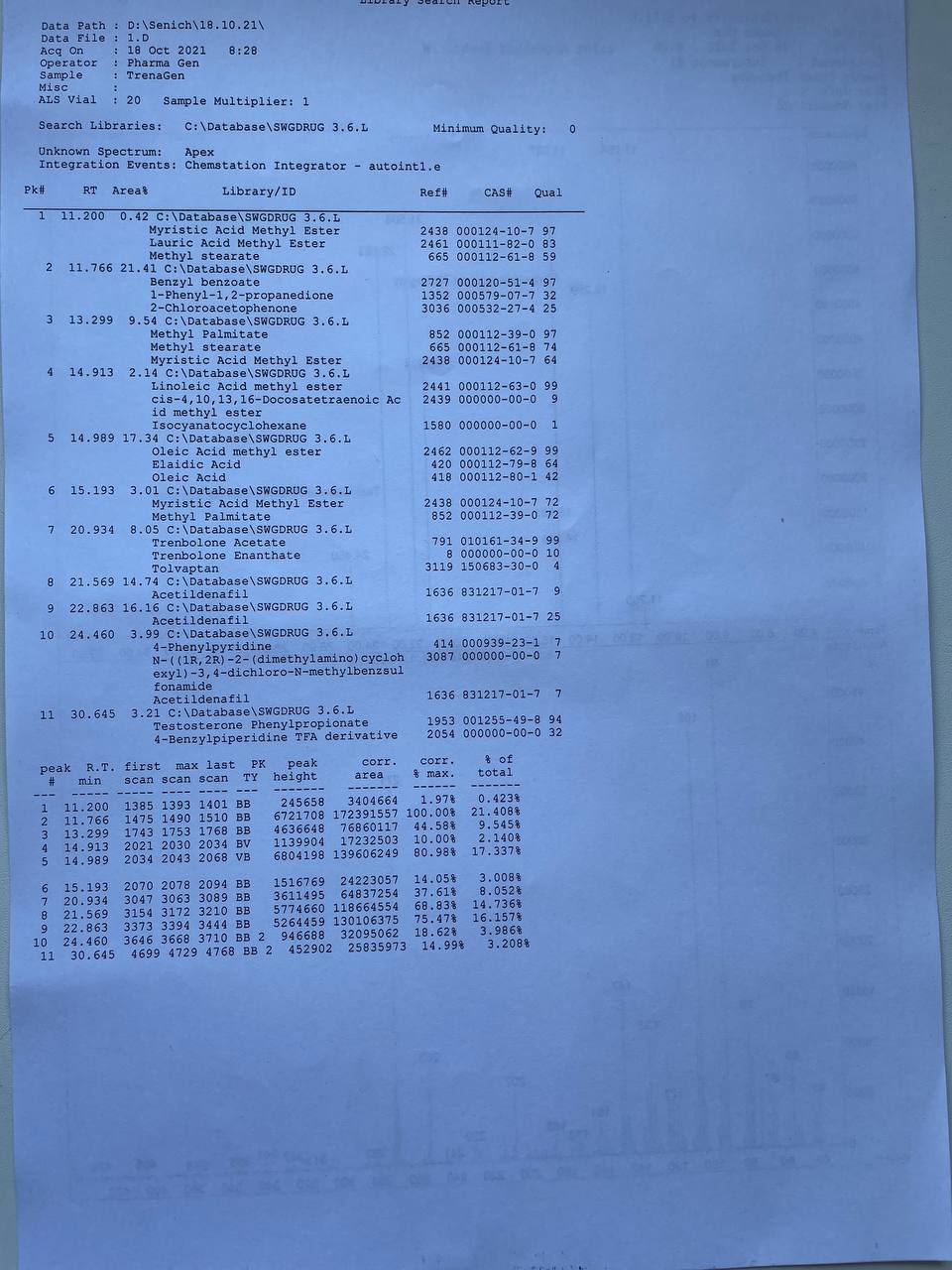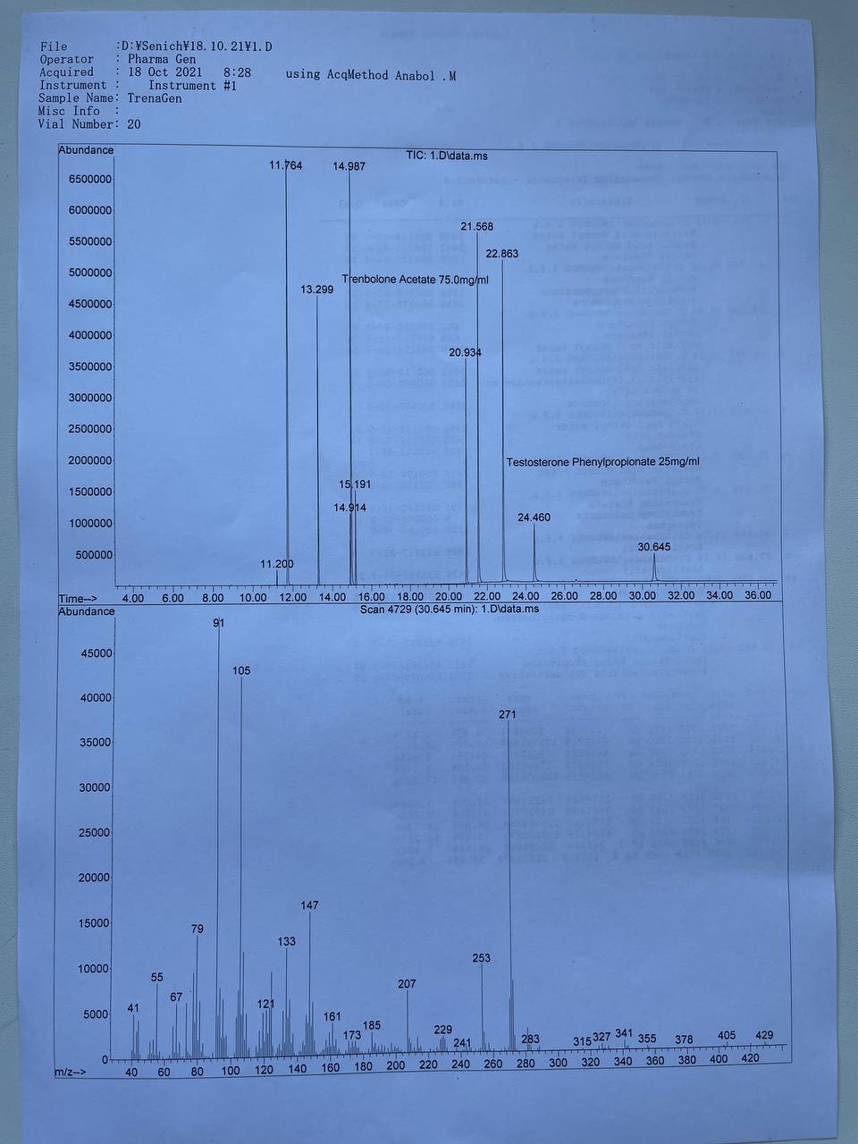 Pharma Gen TRENAGEN Образец представляет собой виалу объёмом 10мл. В которой ДВ заявлено Тренболон Ацетат 100мг/мл. 1) Хроматография: образец содержит Тренболон Ацетат 75мг/мл. ТЕСТОСТЕРОН ФЕНИЛПРОПИОНАТ 25мг/мл! 2) Масс-спектрометрия: Общее содержание ДВ в образце ~100мг/мл. 3)Посторонние примеси: НАЙДЕН АЦЕТИЛДЕНАФИЛ. НАЙДЕН 4-ФЕНИЛПИРИДИН.