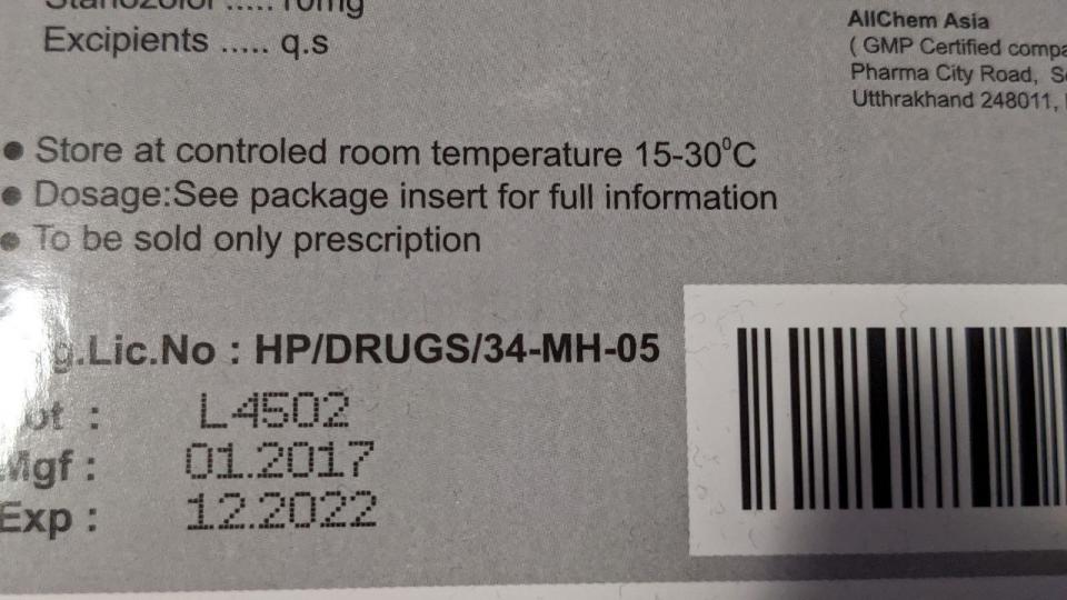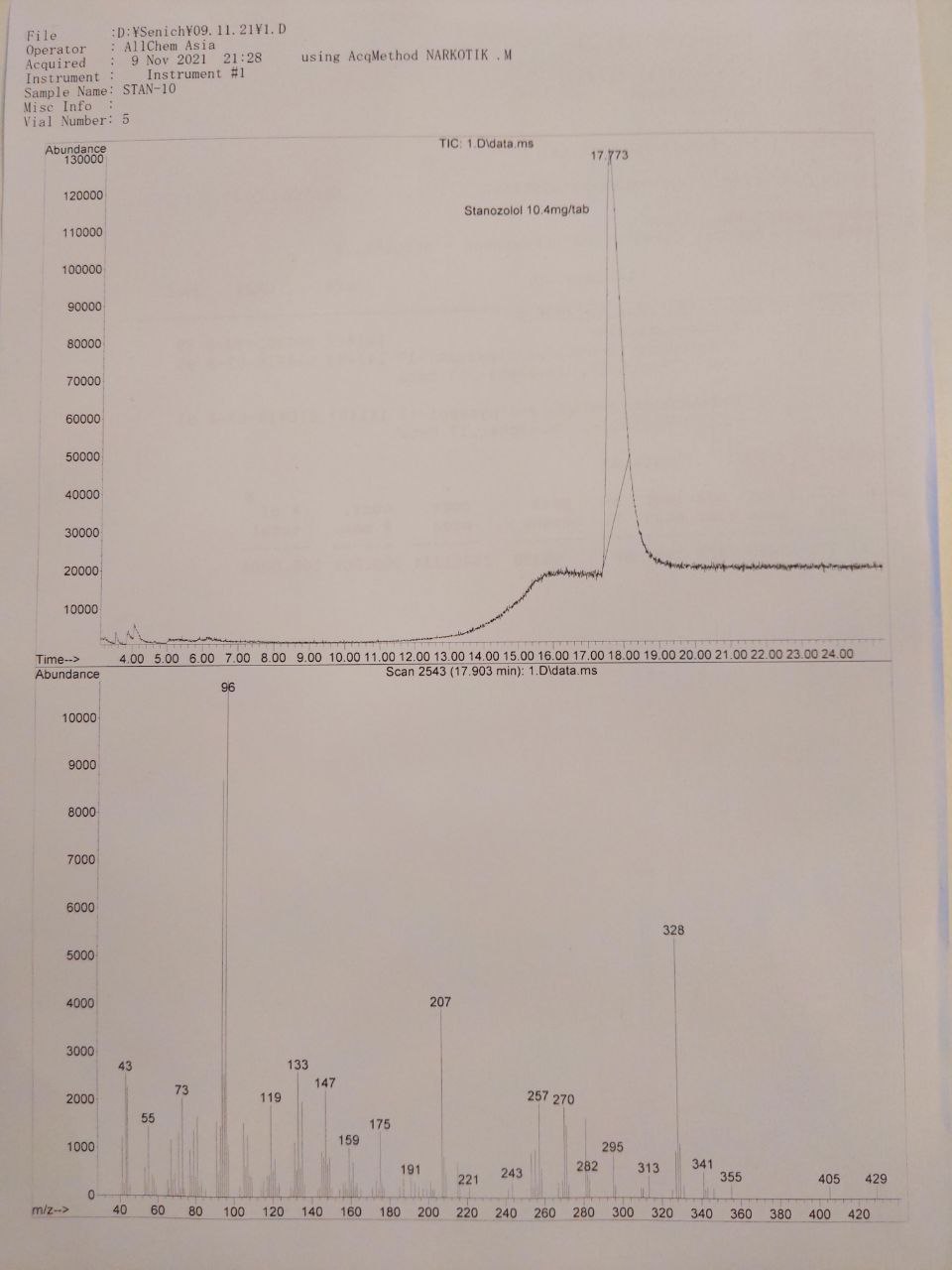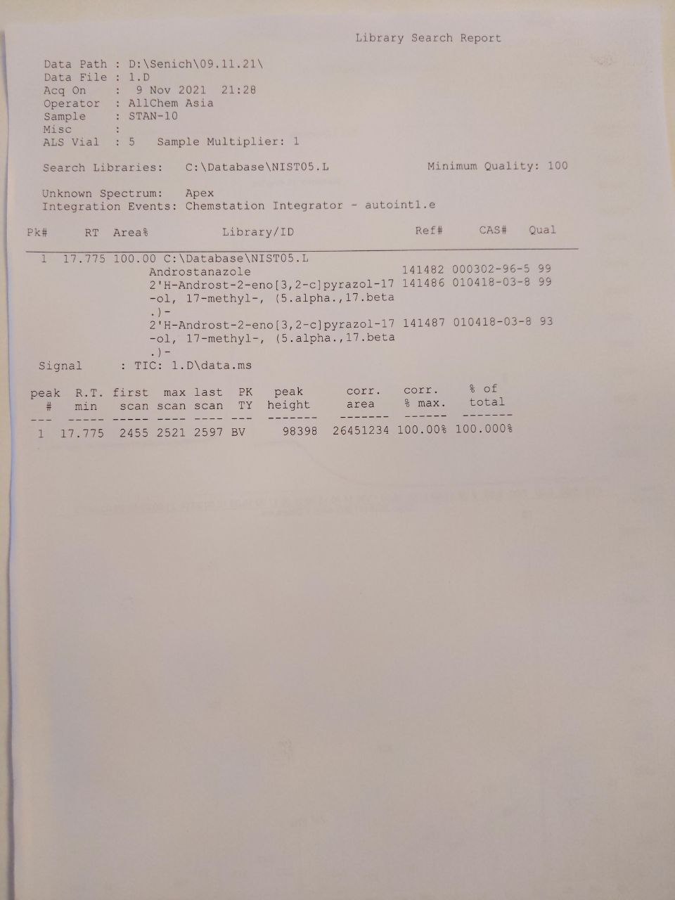 «AllChem Asia» STAN - 10 Lot: L4502 Образец представляет собой таблетки белого цвета. В которых ДВ Станозолол заявлено 10мг/таб. 1) Хроматография: Образец содержит Станозолол. 2) Масс-спектрометрия: содержание ДВ в образце ~10.4мг/таб 3)Посторонние примеси: НЕ ОБНАРУЖЕНЫ