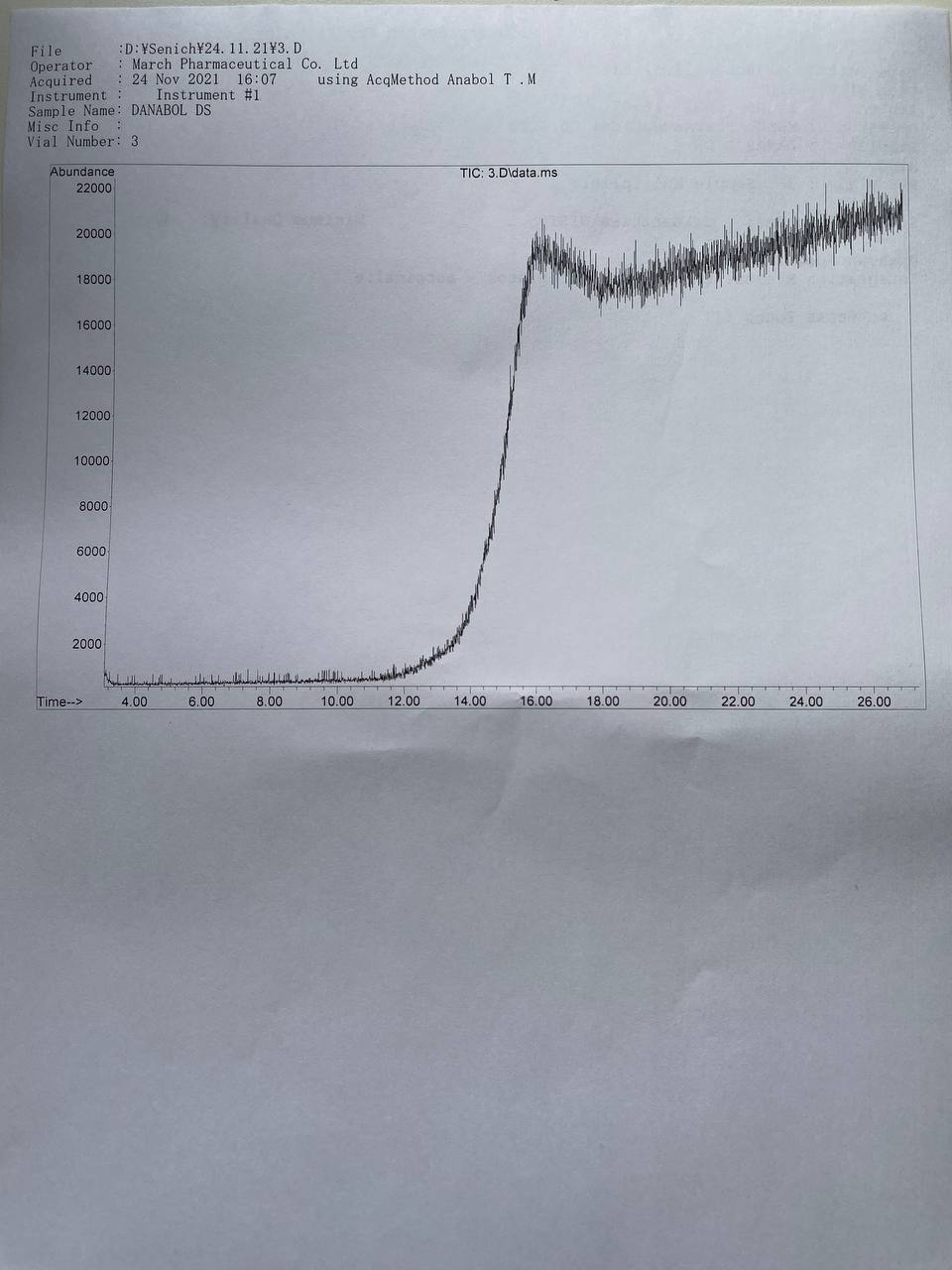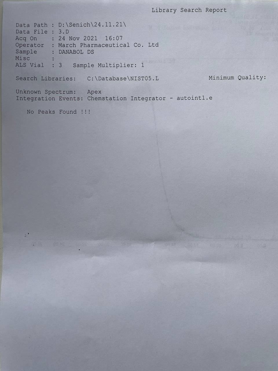 «March Pharmaceutical Co., Ltd.» DANABOL DS Lot: TD II889 Образец представляет собой таблетки синего цвета. В которых ДВ Метандростенолон заявлено 10мг/таб. 1) Хроматография: ОБРАЗЕЦ НЕ СОДЕРЖИТ МЕНАДРОСТЕНОЛОН! 2) Масс-спектрометрия: содержание ДВ в образце - - - 3)Посторонние примеси: НЕ ОБНАРУЖЕНЫ