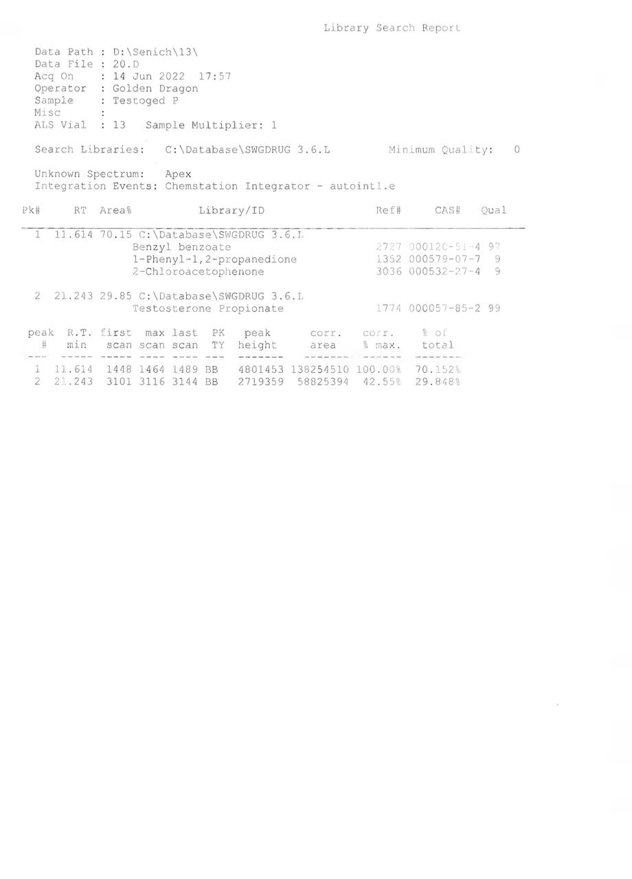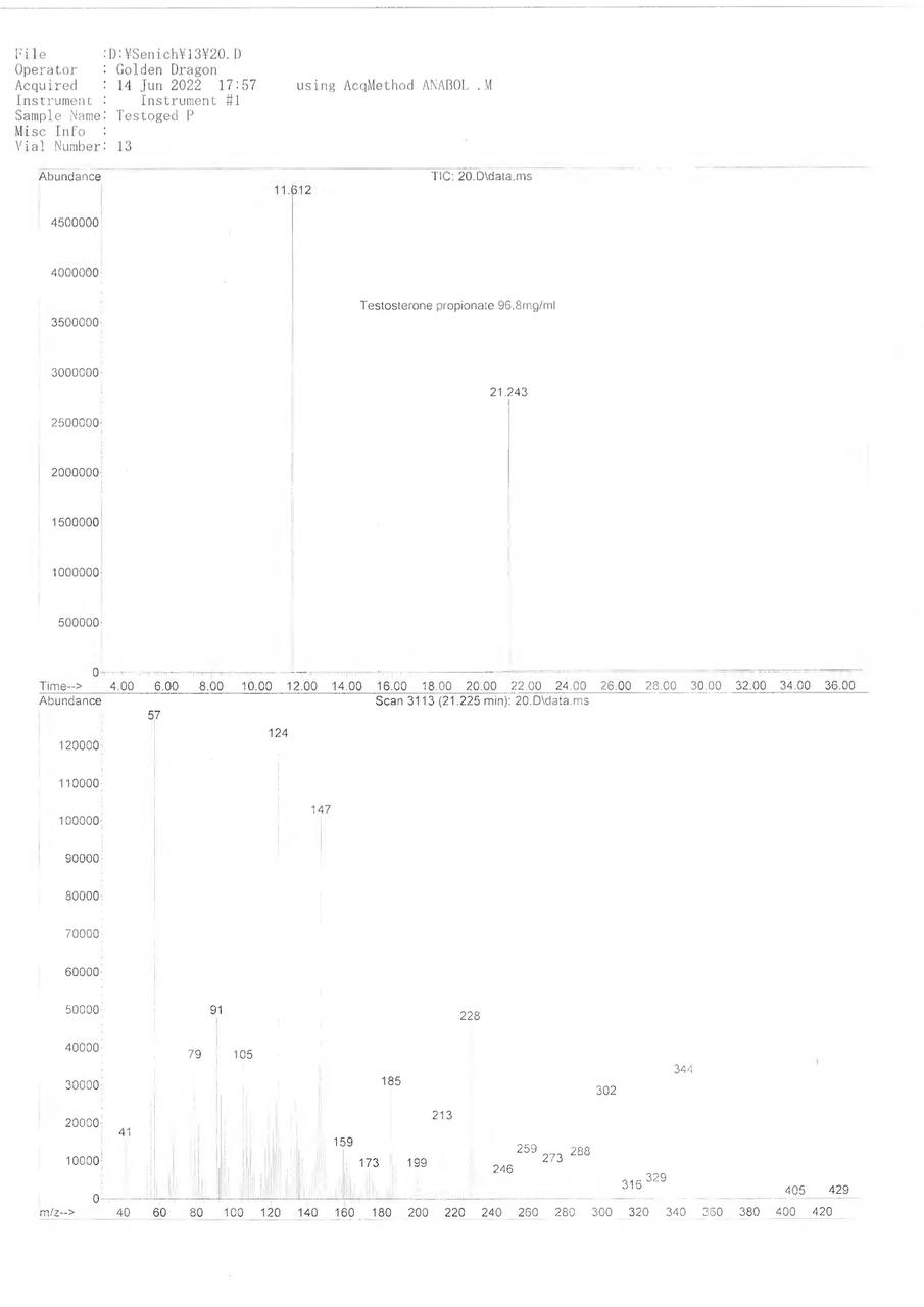 “Golden Dragon” TESTOGED P Batch No: RN15961974 Образец представляет собой виалу объёмом 10мл. В которых ДВ Тестостерон Пропионат заявлено 100мг/мл. 1) Хроматография: образец содержит Тестостерон Пропионат. 2) Масс-спектрометрия: содержание ДВ в образце ~96.8мг/мл. 3) Посторонние примеси: НЕ ОБНАРУЖЕНЫ