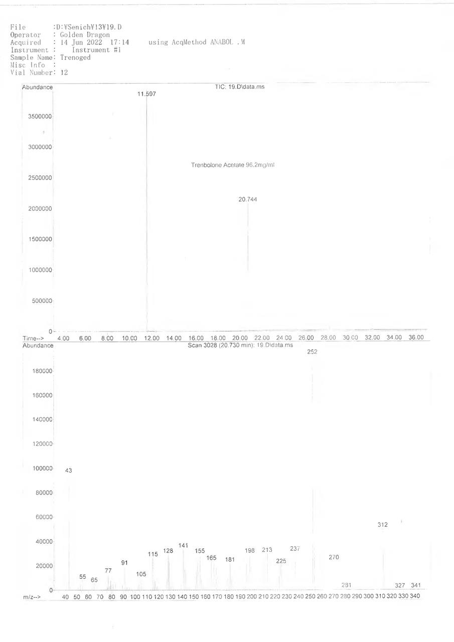 “Golden Dragon” TRENOGED Batch No: GE12510428 Образец представляет собой виалу объёмом 10мл. В которых ДВ Тренболон Ацетат заявлено 100мг/мл. 1) Хроматография: образец содержит Тренболон Ацетат. 2) Масс-спектрометрия: содержание ДВ в образце ~96.2мг/мл. 3) Посторонние примеси: НЕ ОБНАРУЖЕНЫ