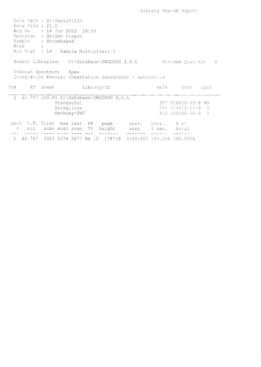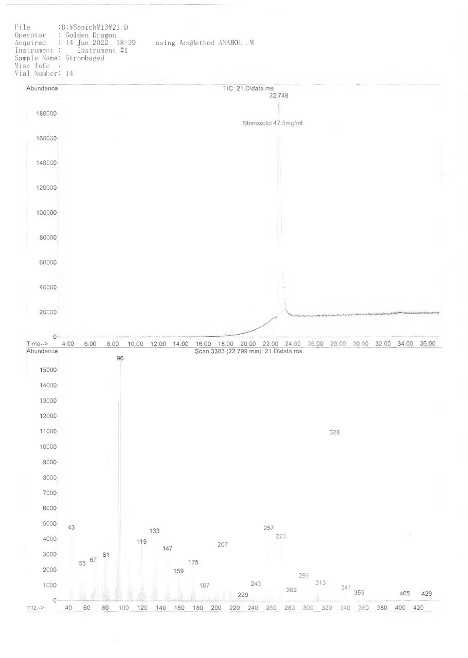 STROMBAGED Batch No: SM62981396 Образец представляет собой виалу объёмом 10мл. В которой ДВ Станозолол заявлено 50мг/мл. 1) Хроматография: образец содержит Станозолол. 2) Масс-спектрометрия: содержание ДВ в образце ~47.5мг/мл. 3) Посторонние примеси: НЕ ОБНАРУЖЕНЫ
