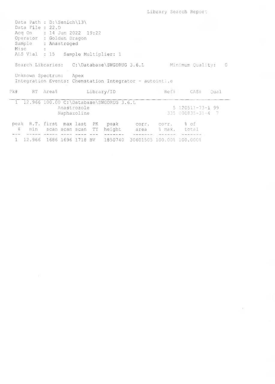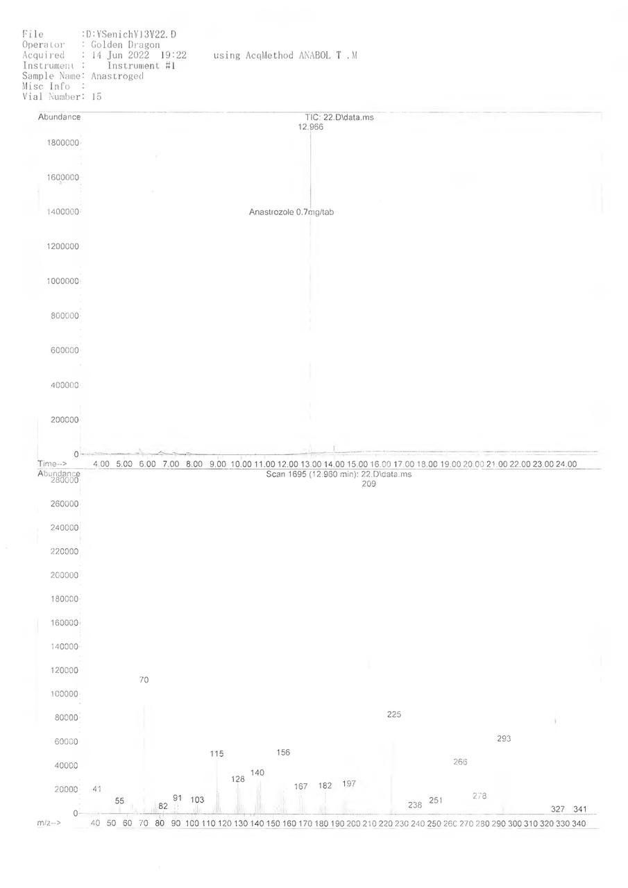 «Golden Dragon» Образец представляет собой таблетки белого цвета. В которых ДВ Анастрозол заявлено 1мг/таб. 1) Хроматография: образец содержит Анастрозол. 2) Масс-спектрометрия: Содержание ДВ в образце ~ 0.7мг/таб. 3)Посторонние примеси: НЕ ОБНАРУЖЕНЫ.