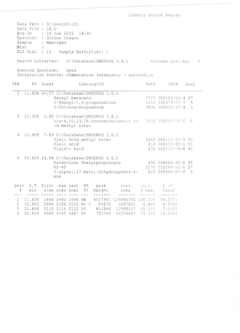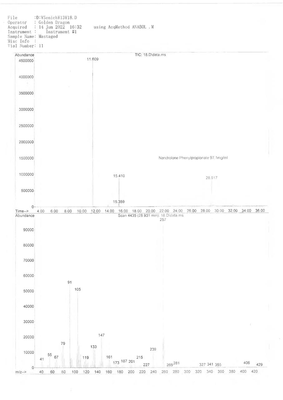 “Golden Dragon” MASTAGED Batch No: WM63812984 Образец представляет собой виалу объёмом 10мл. В которой ДВ Дростанолон Пропионат заявлено 100мг/мл. 1) Хроматография: ОБРАЗЕЦ НЕ СОДЕРЖИТ ДРОСТАНОЛОН ПРОПИОНАТ! СОДЕРЖИТ НАНДРОЛОН ФЕНИЛПРОПИОНАТ! 2) Масс-спектрометрия: содержание ДВ в образце ~97.1мг/мл. 3) Посторонние примеси: НЕ ОБНАРУЖЕНЫ
