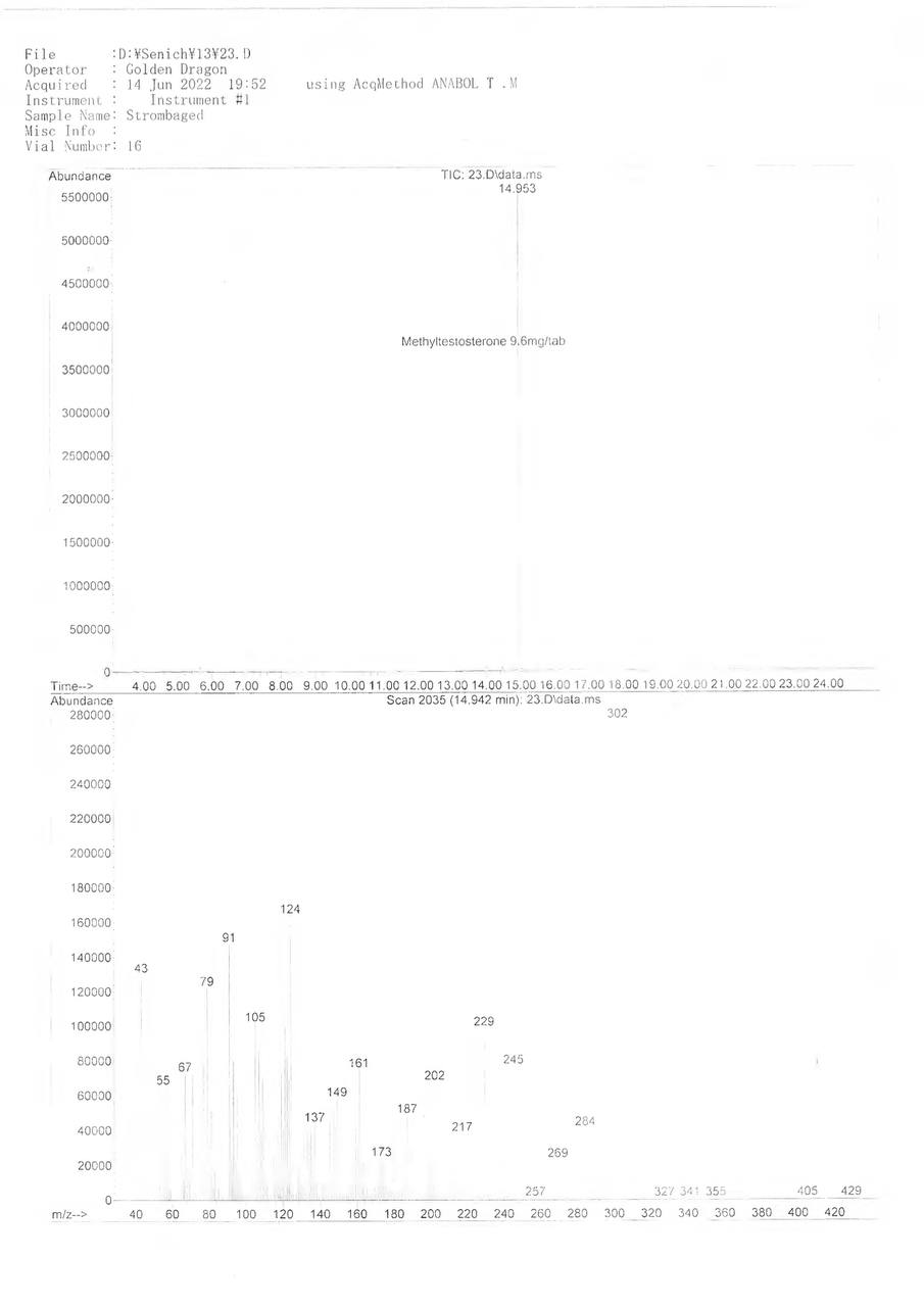 «Golden Dragon» STROMBAGED Batch No: 0111 Образец представляет собой таблетки белого цвета. В которых ДВ Станозолол заявлено 10мг/таб. 1) Хроматография: ОБРАЗЕЦ НЕ СОДЕРЖИТ СТАНОЗОЛОЛ! СОДЕРЖИТ МЕТИЛТЕСТОСТЕРОН! 2) Масс-спектрометрия: Содержание ДВ в образце ~ 9.6мг/таб. 3)Посторонние примеси: НЕ ОБНАРУЖЕНЫ.
